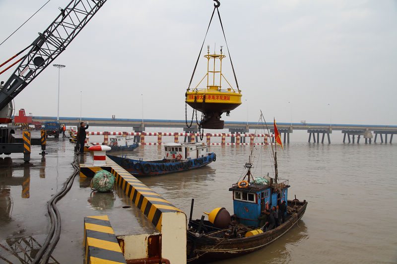 此次投放的水文气象遥测浮标直径3米,技术先进,工作可靠。浮标采用加速度传感器和电子罗盘测量波浪参数,集成安装了WHR1200型声学多普勒剖面流速仪(美国,ADCP),用于观测分层流速、流向;集成安装了OBS-3A浊度仪(美国)用于观测含沙量;集成安装了YOUNG(美国)和VAISALA(芬兰)气象传感器用于观测多项气象参数,观测数据自容记录在浮标内智能采集单元的存储卡上(可定期下载),并且通过CDMA无线网络实时向多个遥测中心发送,远程实时遥测。浮标配有太阳能供电系统可连续工作,浮标上的锚灯夜里自动闪光,防止夜间船只碰撞,还具有GPS定位位置监测、仓盖打开报警、漏水报警、移位报警等功能,有效保障浮标的安全运行。