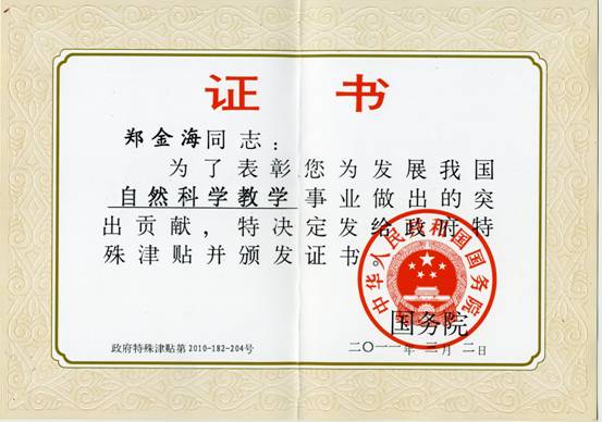 根据人力资源和社会保障部《关于公布2010年度享受政府特殊津贴人员名单的通知》(人社部函[2011]68号)的精神,教育部直属高校和直属单位2010年共有395人获批准享受政府特殊津贴。我院郑金海教授由于在发展自然科学教学事业中的突出贡献获得批准。