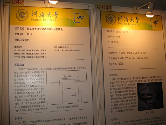此次我院共有2项国家大学生创新性实验计划项目参加展示、1项创新性实验计划项目论文参加创新学术年会的交流;在我校项目展台前,由我院本科港航专业2008级包沐曦主持负责的项目“波能定位救生圈”与本科港航专业2008级范骏主持负责、严士常老师指导的项目“桩基挡板透空堤透浪特性试验研究”作了项目展板展示并同来自全国各高校的同学与老师进行深入交流,引起了专家和多个高校师生代表的浓厚兴趣。本科2008级港航强化班朱峰在创新学术年会上进行了题为“基于SPH方法的碎片穿甲数值模拟”论文研究内容汇报与学术交流,获得了专家组的好评。