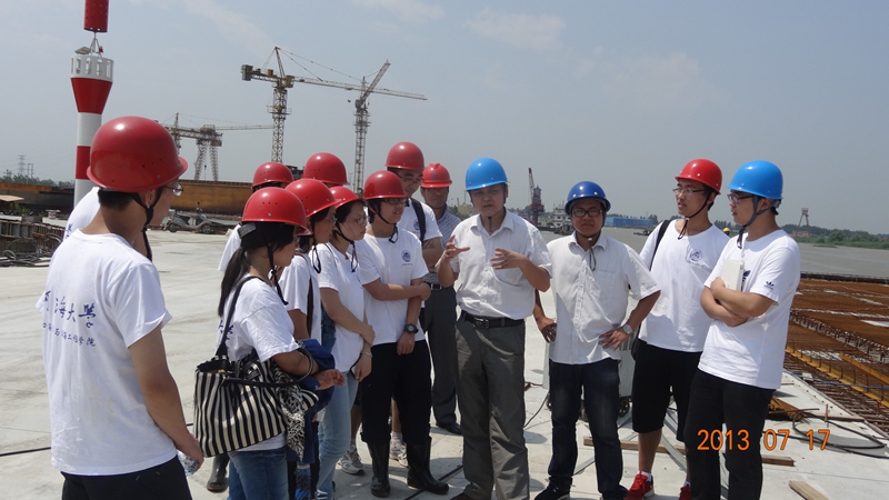 7月14日,实践团队抵达马鞍山港口(集团)有限责任公司,在听完安全知识讲座后,工作人员耐心而全面得讲解了马鞍山港区的历史与发展状况,随后在公司工程部童经理的带领下,参观了马鞍山港口的6、7、8、9号码头。7月15日,实践团队先是在公司林经理的陪同下查阅了公司的一些已建或在建项目的相关项目报表和策划书,下午又跟随相关人员在单位厂房内听取了关于码头运作流程的讲解,收获了不少专业方面的知识。 7月16日,实践团队来到集团在当涂镇的子公司,实地参观考察位于长江边的施工现场,公司林经理向队员们讲解了不同时期钢筋的各种焊接法、接口的数量限制、材料的防护措施等等,小到护栏上的一块水泥斑,所有的一切都有大学问。这使队员们认识到港口建筑是大工程,但再大的工程也是由一砖一瓦积累而成的,更是由一丝不苟的态度与兢兢业业的精神建成的。正所谓细节决定成败真是一点都不夸张。7月17日,实践团队赠与公司感谢锦旗并对集团中的两位河海校友林经理与杨华荣先生进行了采访。临别时,前辈们还教育大家要饮水思源、坚持艰苦朴素的校训并勉励大家努力学好专业知识,为国家的水利事业发展贡献力量。