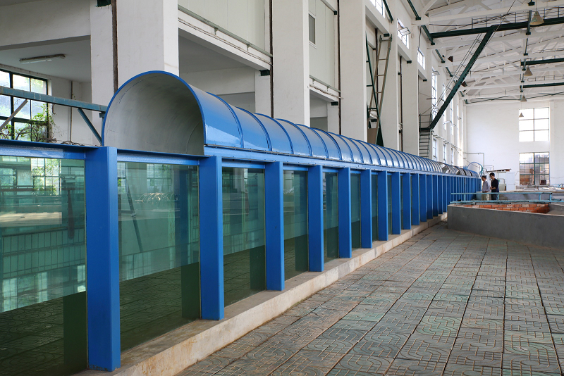 实验中心共有不规则波试验水槽4条,新建造的风浪流水槽尺寸为长85m×宽1.0m×高1.5m,配有带二次反射波全吸收装置的伺服电机型水槽不规则波浪造波系统、循环水流系统、加风系统,能模拟最大波高0.3m、波周期0.5s~5s的不规则波,模拟最大流速0.5m/s(0.5m水深条件下)、最大风速15m/s,该风浪流水槽系统总造价202万元,能进行风、浪、流共同作用或单独作用下的物理模型试验,具备研究海工建筑物在二维不规则波作用下的各种动力响应机制及海岸工程中波浪与建筑物相互作用关键技术和理论问题的能力。