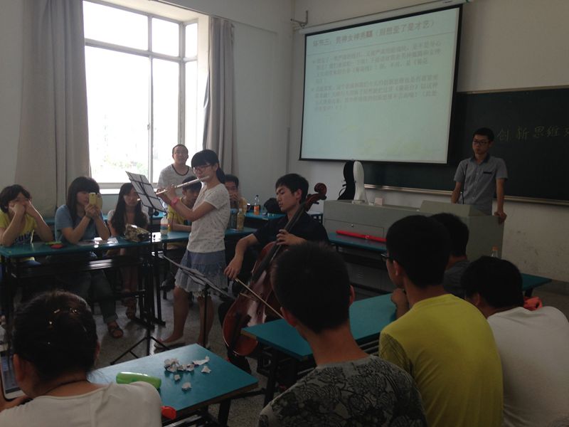 活动中,薛老师就创新训练计划简介、要求和往年概况作了简要介绍,并举出具体的创训实例做出了精彩讲解。薛老师表示,兴趣是完成创训最重要的因素,只有有了研究的兴趣,才能排除万难,取得成功。接下来的创新思维交流会分别从国家、社会、个人角度阐述了创新的重要性:不仅是实现“中国梦”的重要条件,更对社会、个人的发展有着重要影响。随后“谁是卧底”和“急速60秒”的游戏环节更是展现了同学们的聪明才智,猜测、迷惑、诱导等方式都被运用得淋漓尽致。最后,王天羽和戴腾两位同学凭着深厚的音乐功底和独到的创新思维,改变并演奏出了一曲别具韵味的《菊花台》,赢得满堂喝彩!