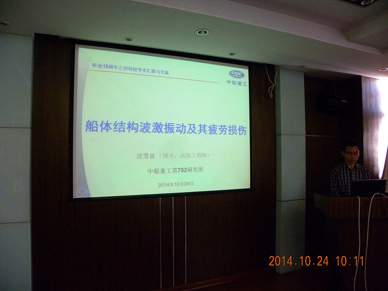 2014年10月24日上午,av影片 兼职教授汪雪良博士受聘仪式暨学术报告会在av影片 严恺馆502举行。授聘仪式由av影片 院长郑金海教授主持。av影片 副院长诸裕良教授主持了学术报告会,院长助理张继生教授及众多师生出席了仪式。仪式上,郑金海院长向汪雪良博士颁发了av影片 兼职教授聘书,学生代表为汪雪良博士佩戴校徽。仪式结束后,汪雪良博士做了题为“船体结构波激振动及其疲劳损伤”的报告,并与师生展开了热烈讨论。