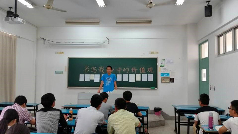 活动地点设在了致高楼209教室,团支部成员们事先在黑板上写下了活动的主题,并且准备好参加同学的作品,在明确好各成员的工作后,活动于下午3点正式开始。首先,班长丁宏伟同学让各位参赛同学在黑板上贴上自己的作品,并且依次介绍自己作品的含义和创作过程。不少同学别出心裁,用自己的方式展示出作品特色,赢得了在场同学的热烈掌声。在参赛同学介绍结束后,大家拿出选票,进入投票环节。整个唱票过程扣人心弦,作品与作品之间的得票数不分上下。最终,蔡嘉同学的毛笔字作品拔得头筹,曹向明同学和苏俊玮同学分别获得第二、三名。接下来,通过小组讨论,大家畅谈对社会主义核心价值观的理解,并积极联系学习生活的实际,表达践行社会主义核心价值观的决心。活动最后,港航1班的同学们拉起横幅,合影留念,“书写我心中的社会主义核心价值观”团日活动圆满结束。
