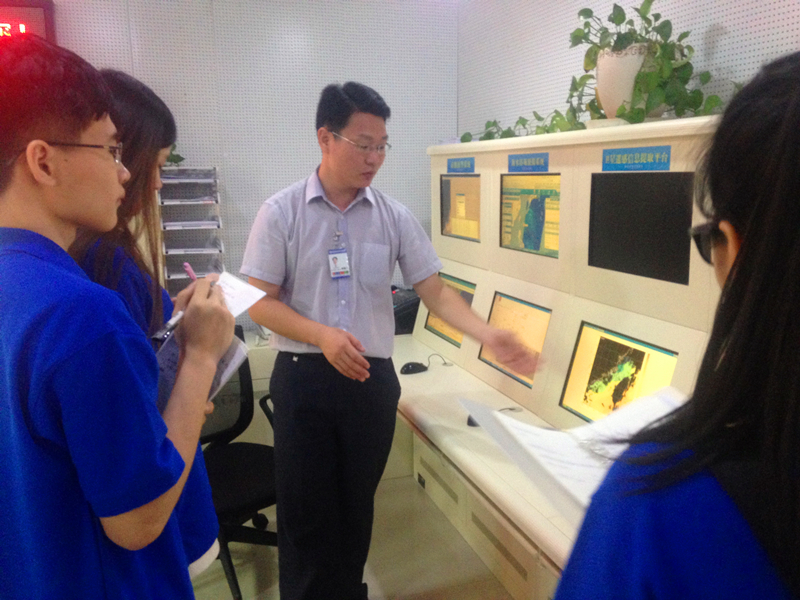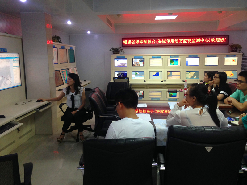 13日上午,队员们观摩了预报台工作人员的一次预报讨论,在激烈的讨论中体现了工作人员的严谨求是精神。之后,由工作人员为队员们介绍海浪观测预报,包括海浪的定义,分类,要素,特征,灾害性海浪和海浪的观测预报,配以形象的ppt,图文并茂。下午,工作人员以近期登陆福建的台风“尼伯特”为例对预报台工作进行讲解,让队员们了解到预报台的工作更多的是在于预报以及配合防汛办,认识到预报台在防灾减灾方面的作用。之后,队员们又向工作人员李星就预报工作方面进行了一次简短的访谈,而李星也表达了对实践团活动的赞赏和鼓励。