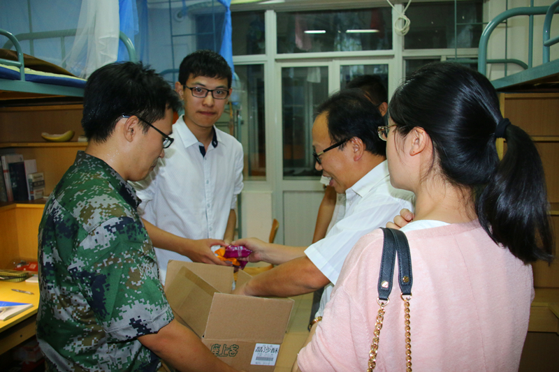 派送月饼活动于21点30分正式开始,首先派送的地点是16级女生宿舍。胡忠华书记,姜海霞副书记和辅导员季超老师带着精心准备的月饼逐一访问了各宿舍。胡书记亲切地问候了在异乡求学的学子们,一边分发月饼,一边询问起了学生的近况,军训期间的情况,对宿舍的意见等等。听到胡忠华书记能准确说出大多数同学的个人信息,同学们纷纷表示很感动,也感激学院领导对他们16级新生的关心和帮助。