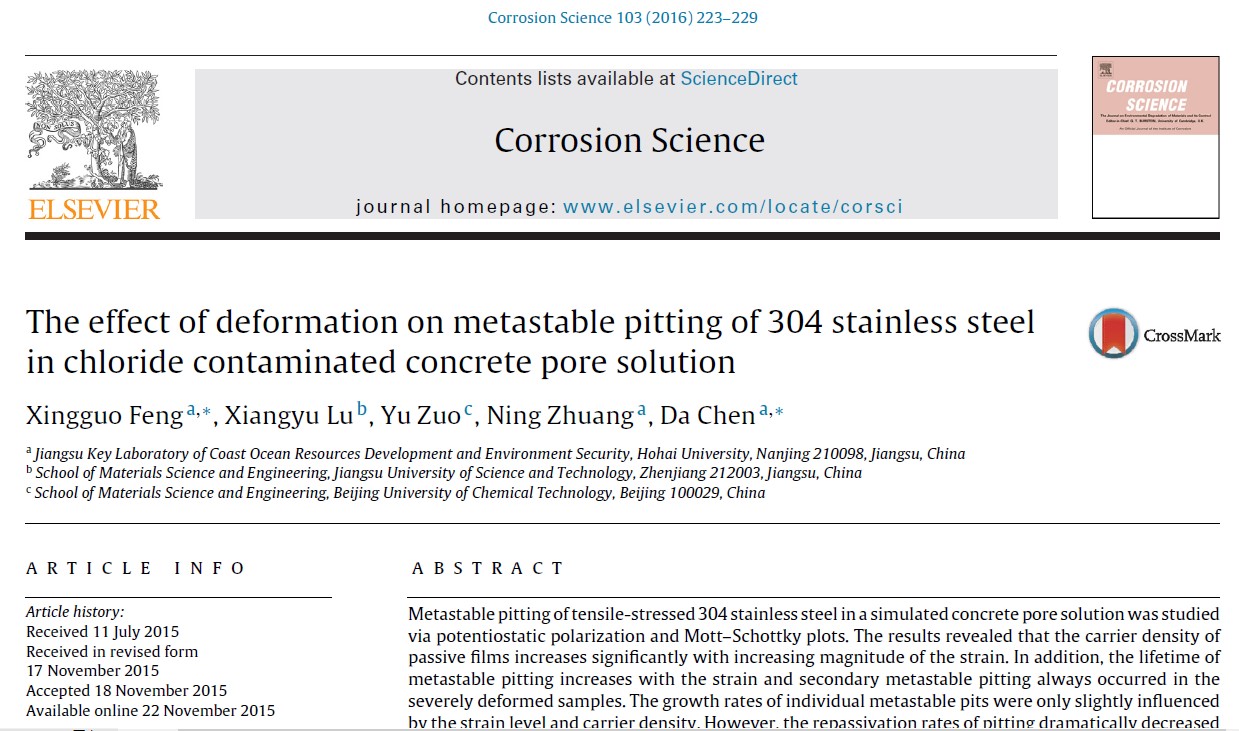 冯兴国副教授(Xingguo Feng)、庄宁副教授(Ning Zhuang)、陈达教授(Da Chen)等针对应力应变加速混凝土结构劣化这一关键问题,结合不锈钢钢筋锈蚀特征,系统研究了应变对不锈钢钢筋孔蚀的影响规律,揭示了应变对不锈钢钢筋孔蚀萌生及生长的影响机制,相关成果发表在国际著名期刊《Corrosion Science》上,研究成果可为预应力混凝土结构的应力设计、不锈钢钢筋混凝土结构的寿命预测等提供参考。