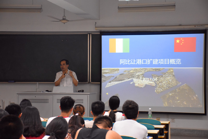 讲座分为两大部分,第一部分围绕国家“一带一路”倡议展开,从一带一路的内涵、背景、成果和愿景四个方面具体介绍,使同学们了解了在国家政策背景下,国内外港口建设形势和未来的发展方向。郑院长勉励同学们正确认识时代责任和历史使命,正确认识远大抱负和脚踏实地,积极修炼,扎实基础。第二部分郑院长为同学们展示了西非港口工程,分析了面临的机遇和挑战。在简单介绍了西非的概况后,郑院长重点介绍了中国港湾西非区域管理中心的运行情况,向同学们展示了西非阿比让港和特马港项目,从港口规划到具体设计,从施工管理到技术攻关,细细解读,层层深入。阿比让港的建设视频,让同学们不禁感叹工程的宏伟和波澜壮阔,专业的自豪感油然而生。在机遇和挑战部分,郑院长分别从学校、学院、学生三个层面进行了分析,希望同学们能够努力锤炼,具备健康的人格体格、过硬的专业知识、良好的工作习惯、灵活的沟通能力和积极的学习态度,直面机遇和挑战。