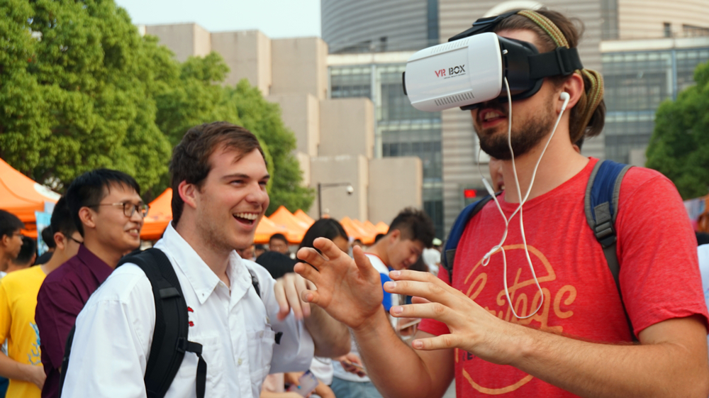 下午4点,游园会活动正式开始,此次学院的“VR”展台活动分为:扎气球、你画我猜、表情包大作战和“VR”展台四个部分。扎气球活动考验着参与者的专注度和维持平稳心态的能力,你画我猜与表情包大作战则充分考量着参与者之间的默契与信任,一系列趣味十足的心理小游戏吸引了许多同学前来参与,而高科技VR更是将本次游园会推向了高潮,同学们争相前来体验,甚至吸引了不少外国友人,让我院的展台充满了欢声笑语,一跃成为人气最高的展台。