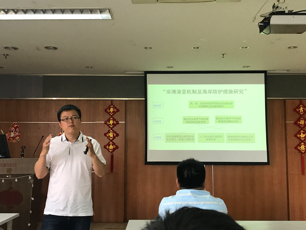 首先上场的是我院海岸带资源与环境研究所所长——陈永平教授,主要从事与风暴潮预警、射流以及岸滩防护方面的研究,他重点介绍了目前在研项目清单以及所在团队的培养模式,介绍了近几届毕业生的去向分布,在场同学都投来了羡慕的目光。第二位上场的是冯兴国副教授,他主要从事不锈钢钢筋混凝土结构以及高效阻锈剂方面的研究,重点讲解了不锈钢钢筋在工程中的实际运用。第三位是研究水动力和海洋防护方向的潘毅副教授,他以Win10的常规更新作为比拟,向同学们生动形象地介绍了科研的过程,从海岸工程方面的经典问题延伸到当前遇到的新问题,其幽默的演讲方式感染了在场同学。最后是海工装备与水下技术研究所所长——徐鹏飞教授,他主张“海洋是人类的战略空间”,主要从事深海结构与航行器设计的研究,和之前来宣讲的老师们研究方向有所不同,拓展到了海洋工程,给同学们耳目一新的感觉。