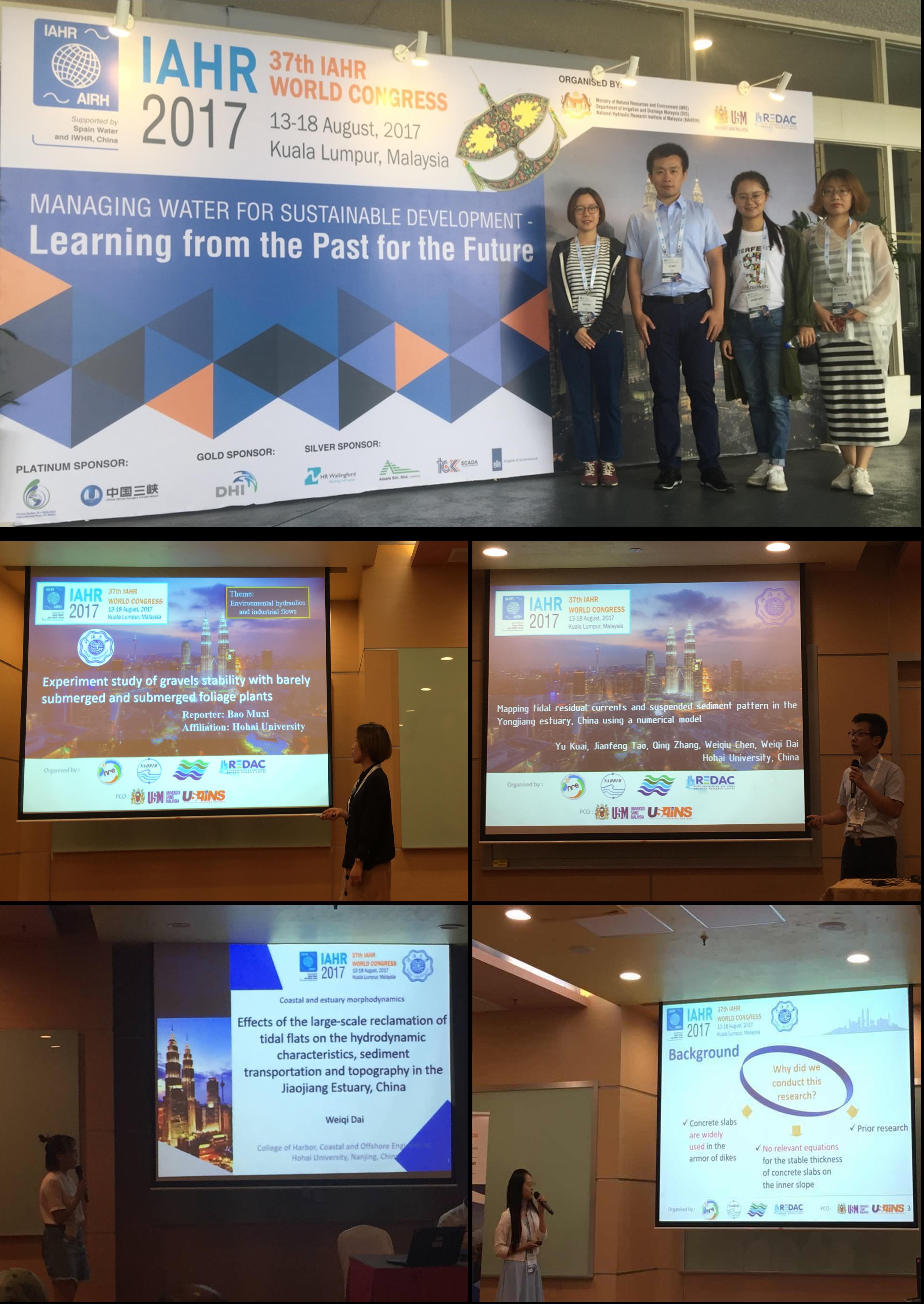 2017年8月13~8月18日,av影片 av影片 博士生包沐曦、戴玮琦,以及硕士生陈伟秋、蒯宇前往马来西亚吉隆坡参加了第37届IAHR(International Association for Hydro-Environment Engineering and Research)国际会议。我院学生分别在大会上作了题为:“Experiment study of gravels stability with barely submerged and submerged foliage plants”, “Effects of the large-scale reclamation of tidal flats on the hydrodynamic characteristics, sediment transportation and topography in the Jiaojiang Estuary, China ”, “Experimental study on stable thickness of concrete slab revetment on inner slope of dikes”和“Mapping tidal residual currents and suspended sediment concentration pattern in the Yongjiang estuary, China using a numerical model”的口头报告,并与国际同行进行了深入交流。