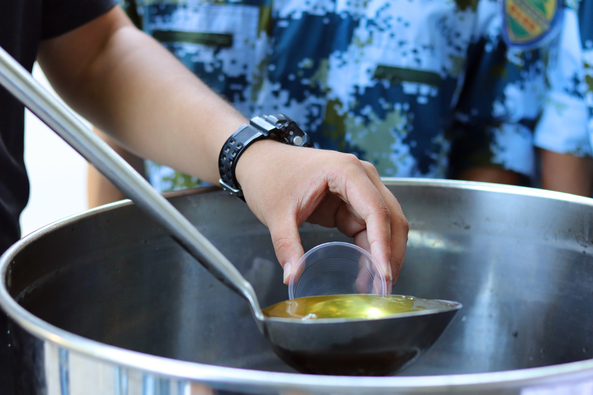 随后,一行人又来到了三连,看望在此军训的男生们。训练结束,男生们早已迫不及待,在接过一杯杯凉茶的同时,也不忘对辅导员和学长学姐们表达着自己由衷的谢意,大家一边说笑,一边品味“清凉”,在融洽的气氛中,忘却了一身的疲惫。