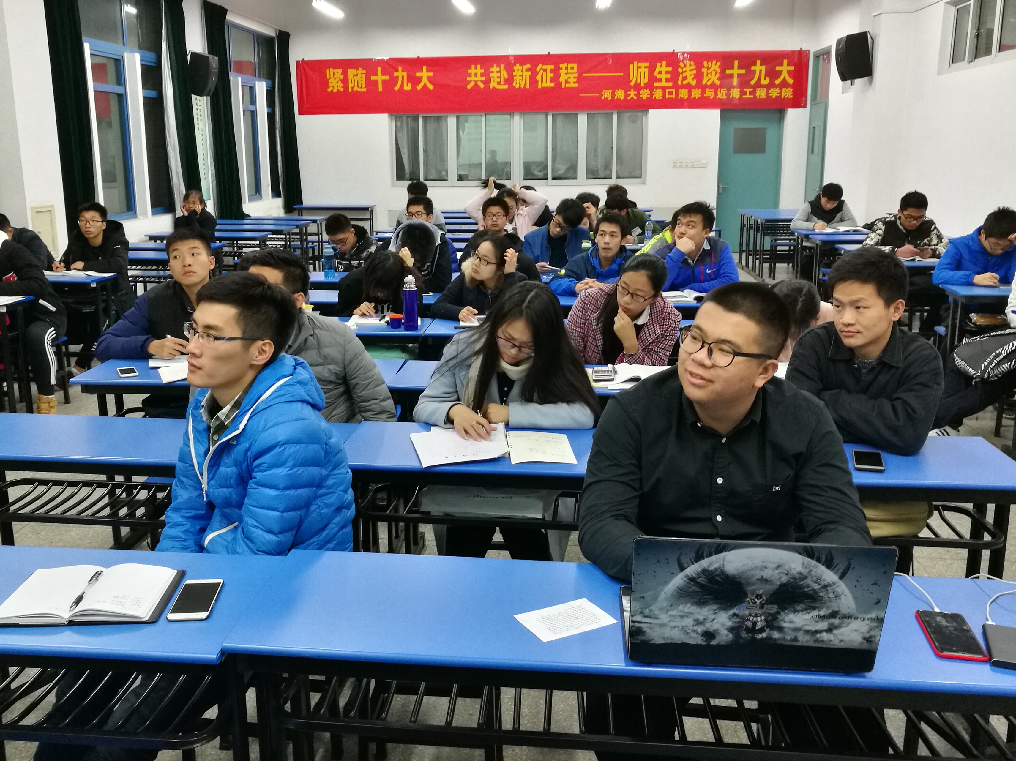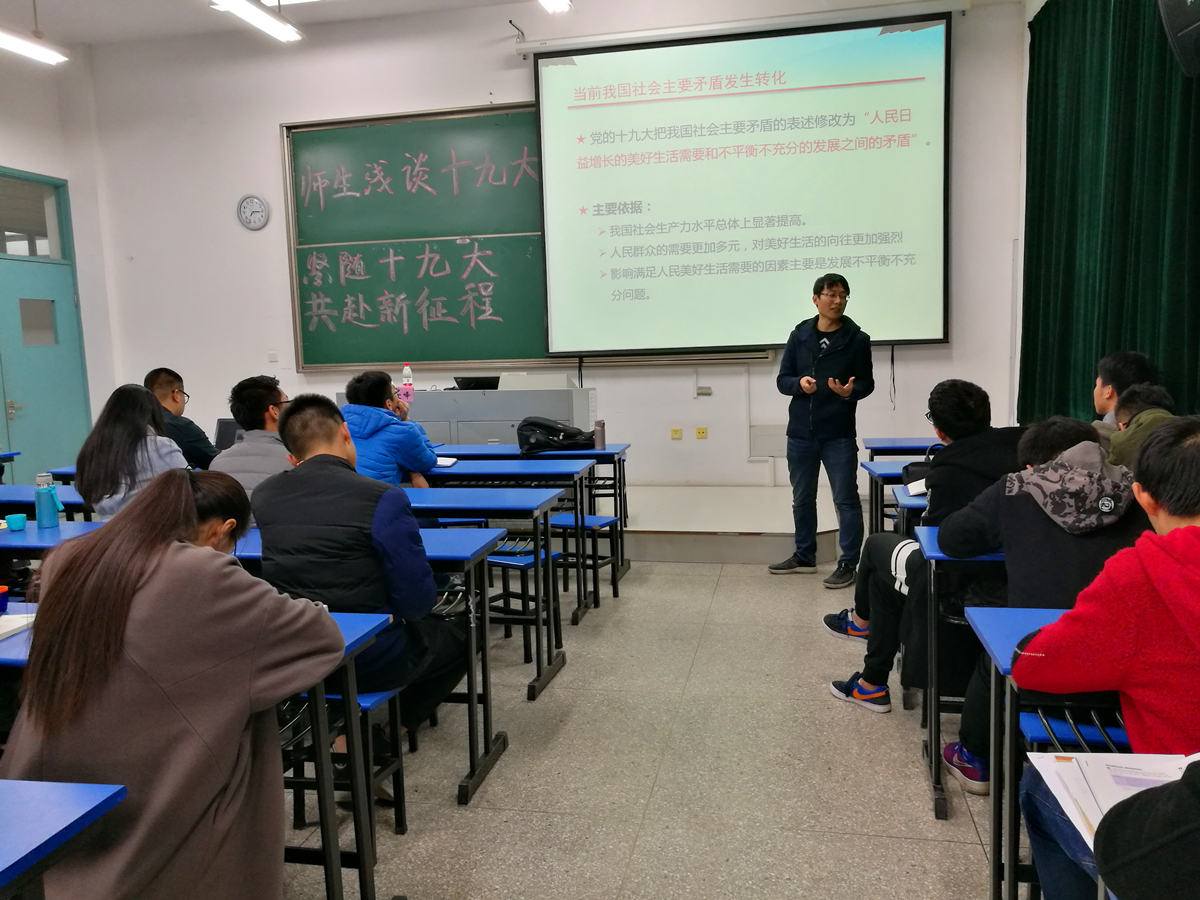 2017年11月30日晚6点30分,av影片 2016级港航3班在江宁校区励学楼109教室举办了“紧随十九代,共赴新征程——师生浅谈十九大”交流活动。活动邀请到了av影片 海工所陶爱峰老师,来带领同学们共同学习十九大。