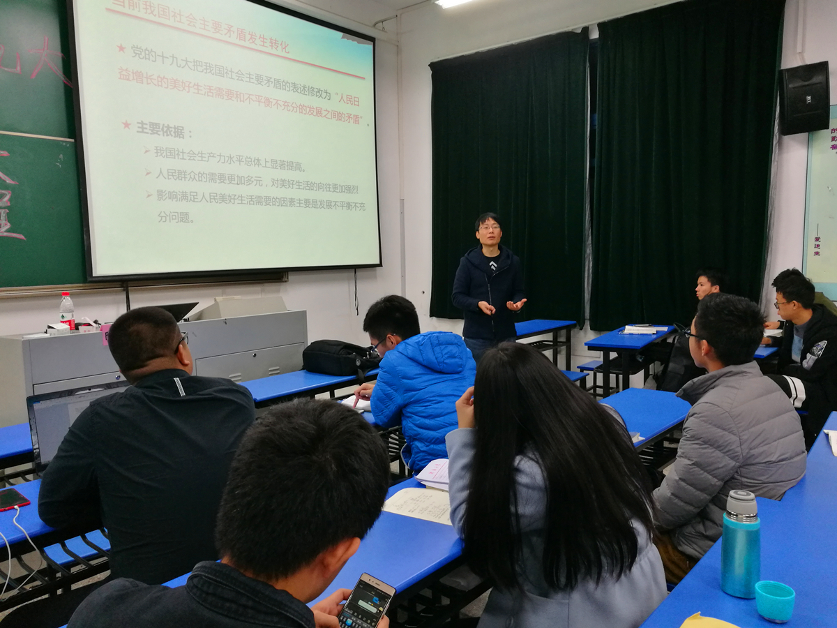 活动开始,陶老师对“新征程”三个字进行了解读,认为党的十九大是一次有划时代意义的大会,她开启了中国梦新的征程。同时,陶老师结合自身成长经历,用生动形象的语言带领大家一起学习了“习近平新时代中国特色社会主义思想”、“五位一体”等重要思想,引导同学们去理解和思考,如何把报告里的精神运用到实际生活实践中。最后,陶老师鼓励大家在生活中要多思考多实践,脚踏实地,不忘初心,共创未来。