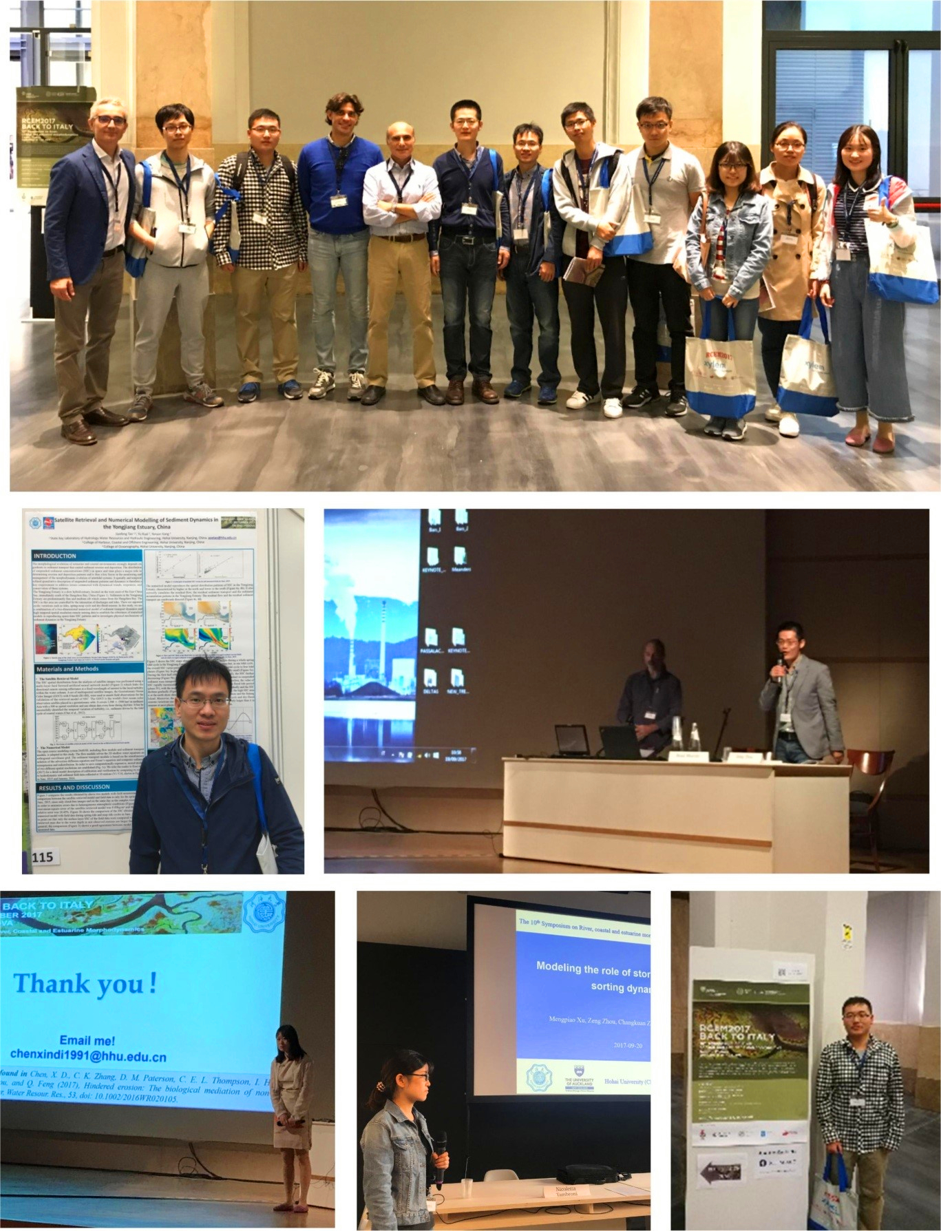 The 10th Symposium on River, Coastal and Estuarine Morphodynamics (RCEM 2017) was held in University of Padova during Sept. 16-23, 2017. More than 300 scholars from around the world participated the conference. Associate professors TAO Jianfeng and ZHOU Zeng, PhD candidates XU Fan, CHEN Xindi, XU Beibei and GEN Liang, master students ZHANG Qing and XU Mengpiao from our college also participated and gave oral and poster presentations. The conference had 14 parallel sessions, and associate professor ZHOU Zeng was invited to chair the “Delta” session. Invited by Dr. Andrea D’Alpaos, they visited the physical model laboratory on tidal creek network in University of Padova.