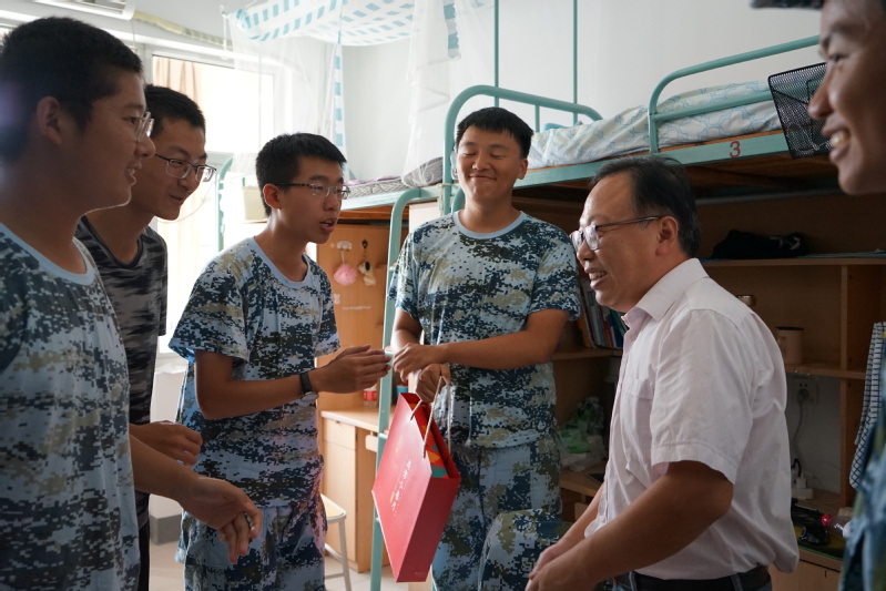 在宿舍里,胡书记和姜书记同新生亲切交谈,关心新生的入学三周大学生活适应情况、身体和心理状况,询问生活设施便利与否,并就学习方面的话题同学生们展开交流。胡书记为同学们悉心讲解大学学习中的注意事项,指导学生们有计划、有重点、有步骤地学习专业课程,通过举例亲身学习经验和方法,为新生自主规划学习和生活指明了方向;姜书记非常关心新生生活适应情况,询问军训训练强度,提醒新生与家人多沟通。两位书记期望学生们以学习为主,同时拓宽视野,开发综合能力,鼓励同学们锻炼身体、保持良好的心态。最后,两位书记为每一间宿舍送上了月饼礼盒以表学院对学生及学生家庭的关怀和诚挚的中秋祝福。