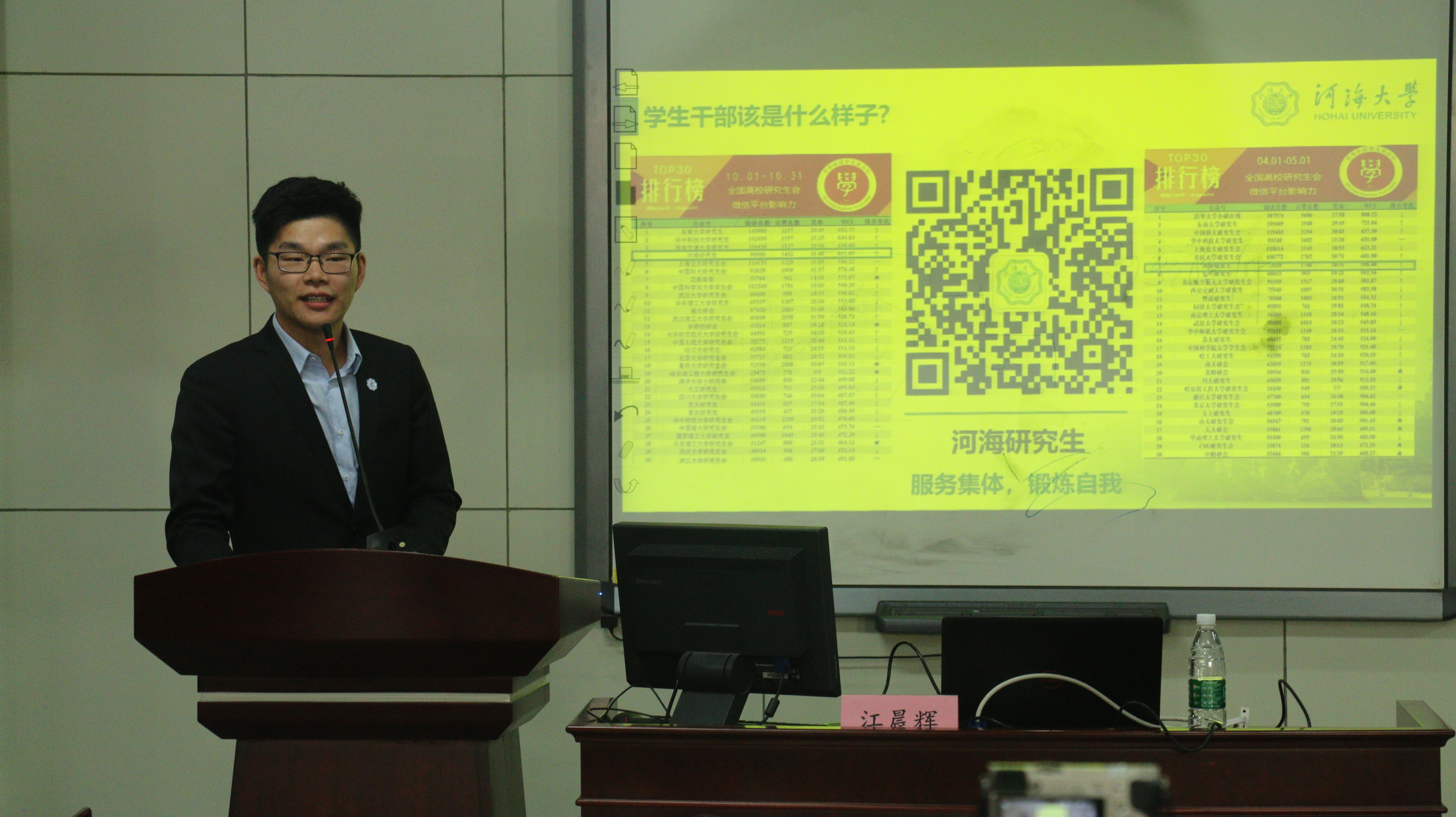 江晨辉同学以介绍其主要工作经历展开讲座,忆述了他作为干事时走过的弯道与坎坷,以期告诫同学们一个道理:凡事先汇报,随时谨记自己的角色。