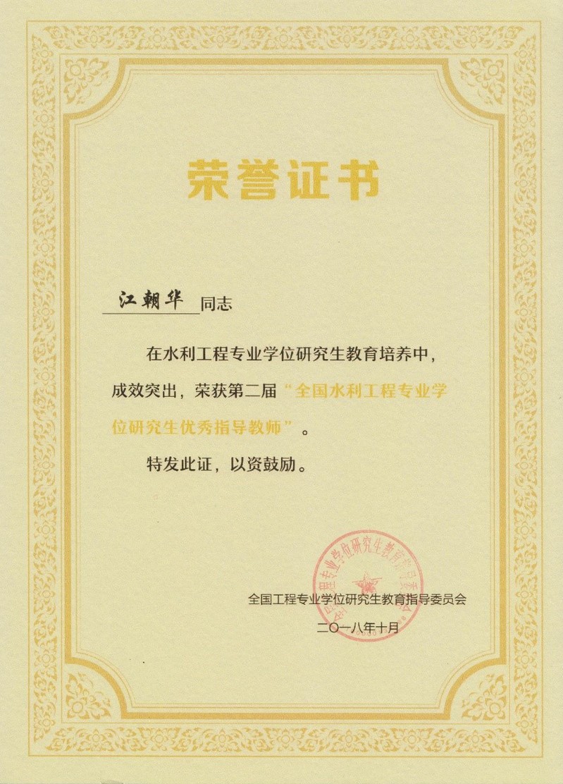 近日,全国工程专业学位研究生教育指导委员会公布了第二届“全国水利工程专业学位研究生优秀指导教师”获奖名单,我院江朝华老师成功入选。