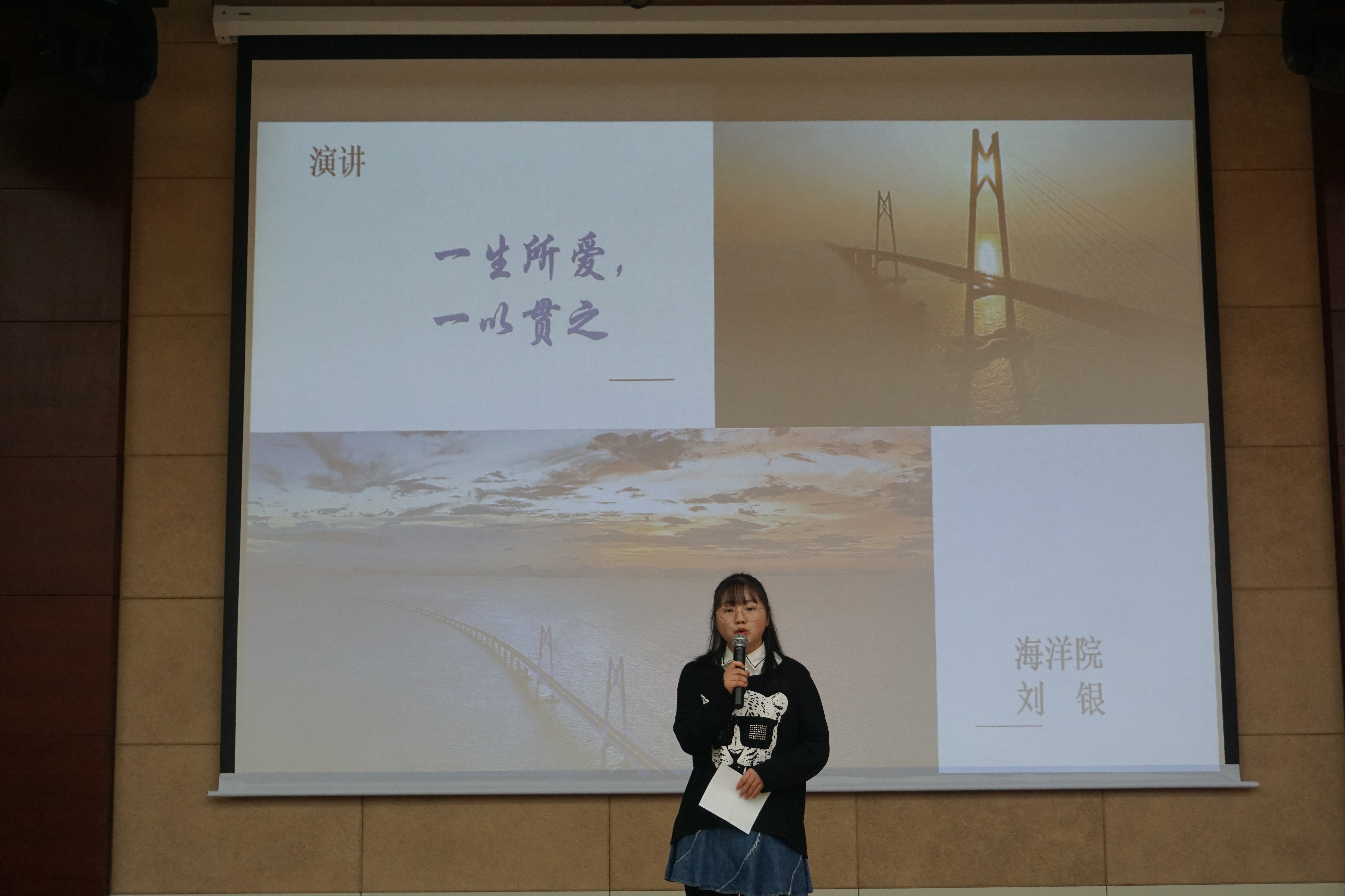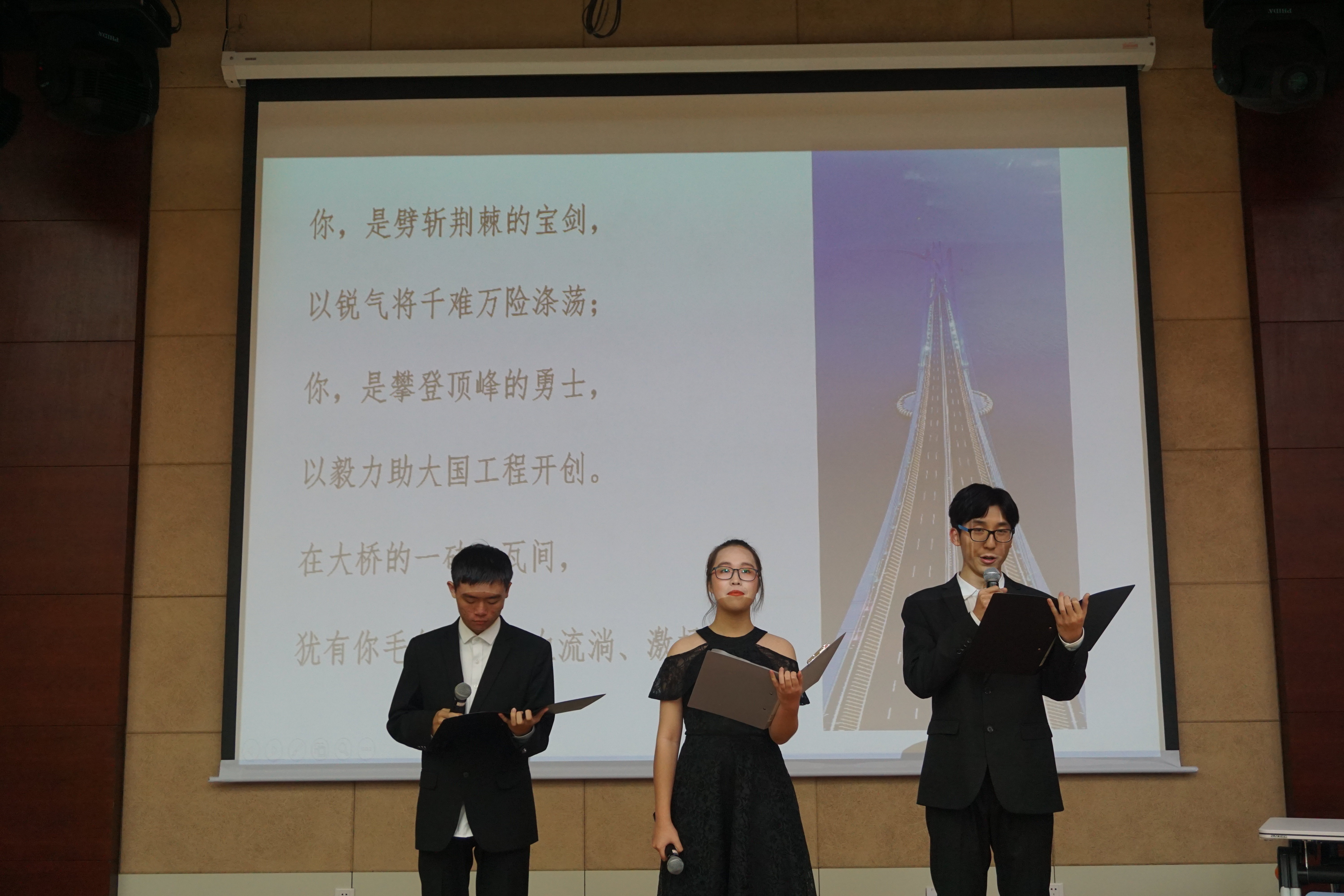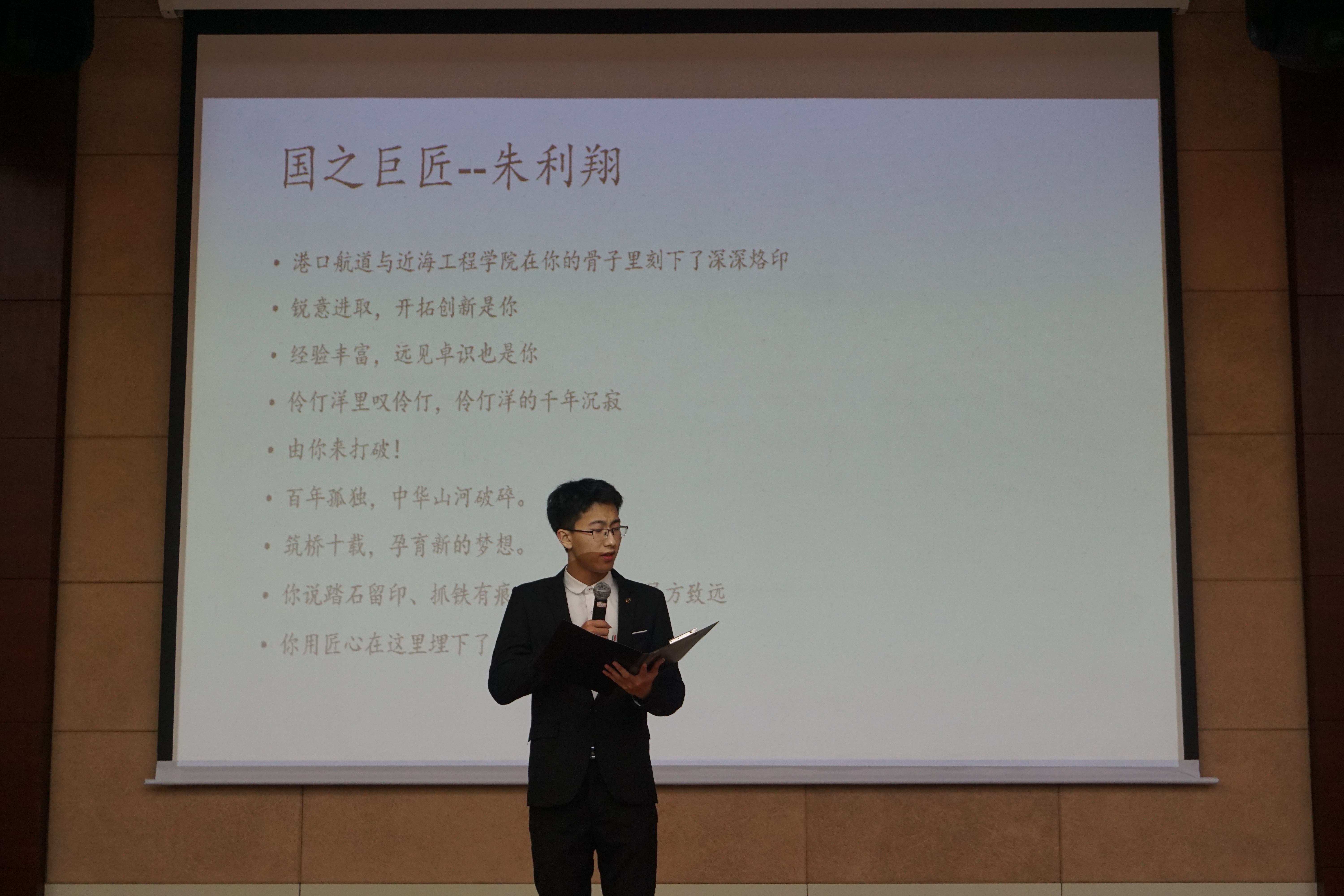 、海洋院、力材院等学院的同学用演讲或朗诵的形式分别介绍了卢永昌、朱利翔、朱峰等校友的事迹,有讲述卢永昌三十多年坚守岗位的心酸历程和其从未改变的爱国初心的演讲《一生所爱,一以贯之》;有追寻朱利翔所践行的“牺牲个人,回报社会,奉献国家”人生准则的演讲《以工匠之名,铸中国之梦》;还有深情歌颂港珠澳大桥讴歌伟大祖国的朗诵《盛世中国》等。选手展示结束后,王宁可老师和陈智老师分别进行了点评,认为同学精神状态好、参赛作品创意好以及最终的活动成效好。