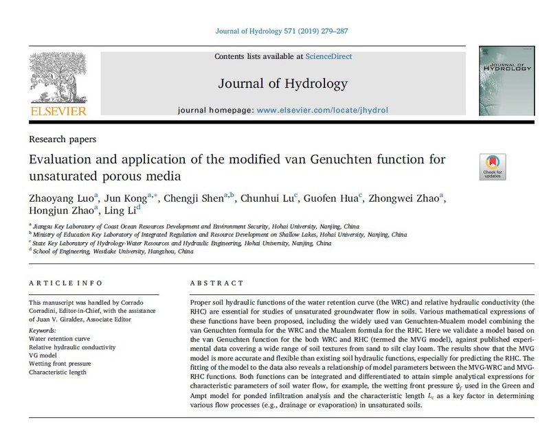 近日,我院2017级博士研究生罗照阳(导师:孔俊教授)在《Journal of Hydrology》上发表了题为“Evaluation and application of the modified van Genuchten function for unsaturated porous media”的学术论文,该研究是继孔俊教授团队在土壤非饱和流研究领域的又一重要成果。