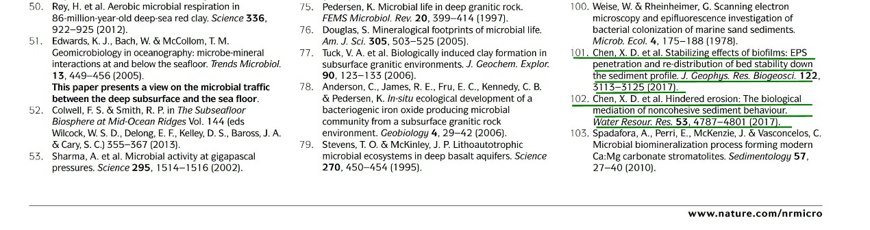 近期,我院潮滩动力地貌研究团队的两篇学术论文同时被国际顶尖学术期刊Nature旗下子刊Nature Reviews Microbiology(2017-2018最新影响因子31.851)上发表的论文“Bacteria and archaea on Earth and their abundance in biofilms”引用。该综述定量统计、总结了全球范围内菌类生物膜的分布及其在人类、海洋、陆地等生态动力环境中的重要作用。文中我院潮滩动力地貌团队2017年发表的两篇关于潮滩泥沙生物稳定性的研究成果均被引用,其分别为发表在一区期刊《Water Resources Research》上的论文“Hindered erosion: The biological mediation of noncohesive sediment behavior”和发表在二区期刊《Journal of Geophysical Research: Biogeosciences》上的论文“Stabilizing Effects of Bacterial Biofilms: EPS Penetration and Redistribution of Bed Stability Down the Sediment Profile”。论文第一作者为陈欣迪博士生,其导师是张长宽教授。论文的合作作者包括我院龚政教授、陶建峰副教授、周曾副教授、周晶晶博士以及环境学院冯骞副教授。此外,英国南安普顿大学与圣安德鲁斯大学的业内知名学者也合作参与了本项研究。
