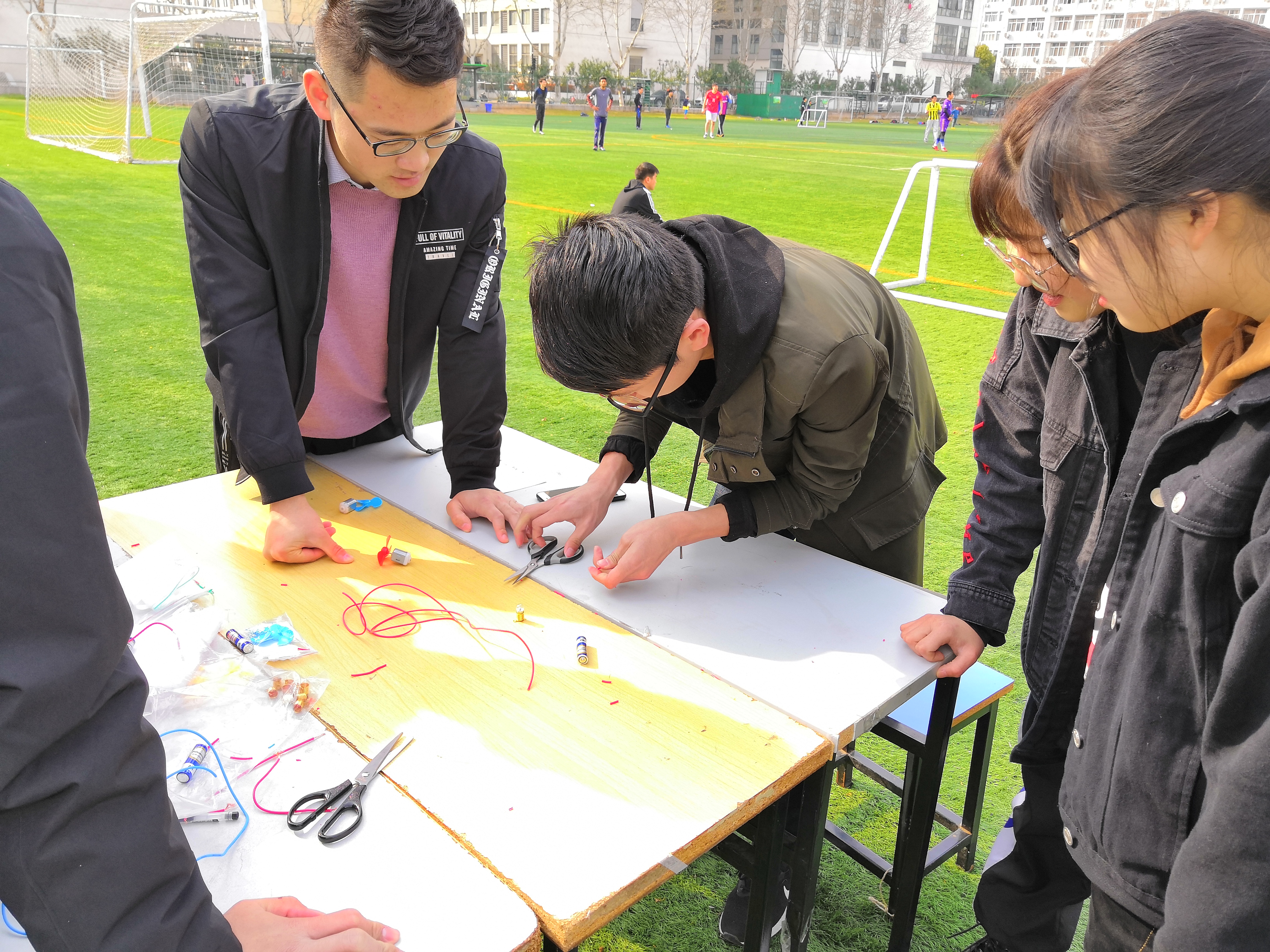 下午3点,参赛选手抵达出发点小浪底广场,工作人员进行比赛规则的详细介绍。之后,比赛正式开始。选手们四人一组,沿着规划好的路线分别前往各个关卡。选手们全身心投入比赛,处处可见团队合作的成果,一人裁剪导线,一人安装风扇,一人连接电池,一人扶持装置,小组成员彼此团结协作,战胜了一个个难题。随着各组成员回到小浪底,并一同合影留念,本次活动圆满落幕。