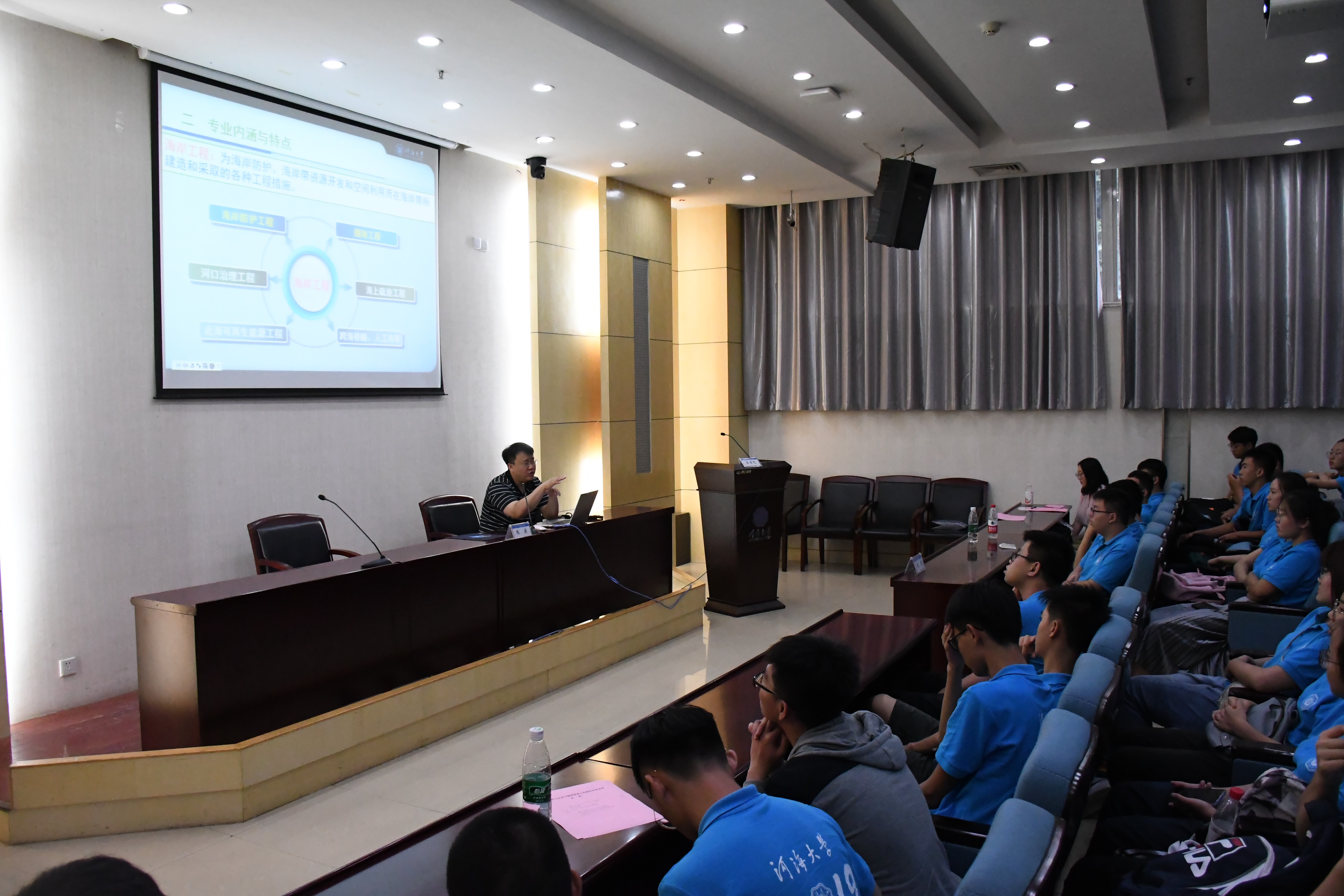 8月28日下午3点,2019级全体本科生齐聚西康路校区闻天馆,分专业参加专业认知讲座。学院副院长张蔚教授和海岸带所副所长陈君老师分别就港航专业和海洋资源开发技术专业做专业介绍。