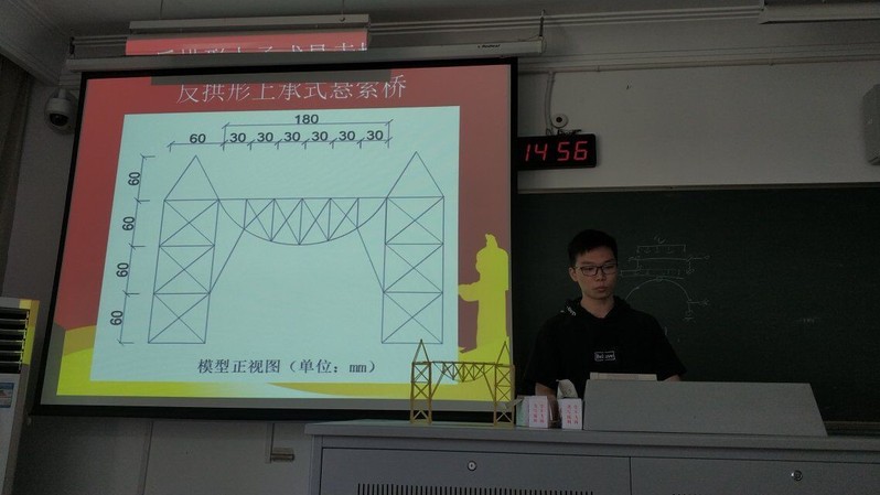 比赛通过现场答辩和承重测试两个环节组成,答辩及承重顺序由现场抽签决定。在答辩环节,各组负责人使出浑身解数,从设计思路、创作过程以及设计亮点等方面对自己的作品进行了介绍和展示。各组模型都别出心裁,花样百出,桥梁类型包括单拱桥、悬索桥、桁架桥及其它专用桥梁,令人称赞不已。