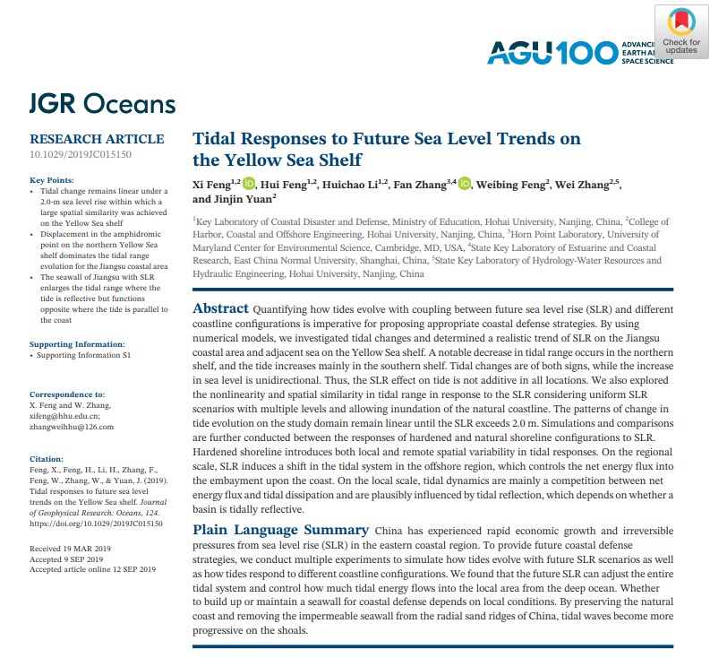 近日,隶属海岸灾害及防护教育部重点实验室(av影片 ),(Key Laboratory of Coastal Disaster and Defence (Hohai University), Ministry of Education)的冯曦老师携研究生冯辉、李慧超等在国际学术TOP期刊《Journal of Geophysical Research: Oceans》上发表高质量研究论文“Tidal responses to future sea level trends on the Yellow Sea shelf”。该论文阐明了复杂海岸带环境下,海平面上升与潮能演化之间的动态规律,首次界定了在中国特有的开放式海岸条件下,近岸潮能演变规律由线性形态到非线性形态的零界位置。同时,指出了在刚性和柔性护岸不同条件下,黄海大陆架近岸潮能应对海平面上升的自适性。该论文反映了平行岸线的前进潮波与垂直岸线的类驻波潮波与不同护岸之间的组合关系;从运动机制与动力机制两方面分别揭示了柔性护岸与刚性护岸工程对近未来(100年间)潮能发展的状态。该成果不仅具有重要的理论意义,而且对目前我国的生态护岸工程也有广泛的现实借鉴作用。