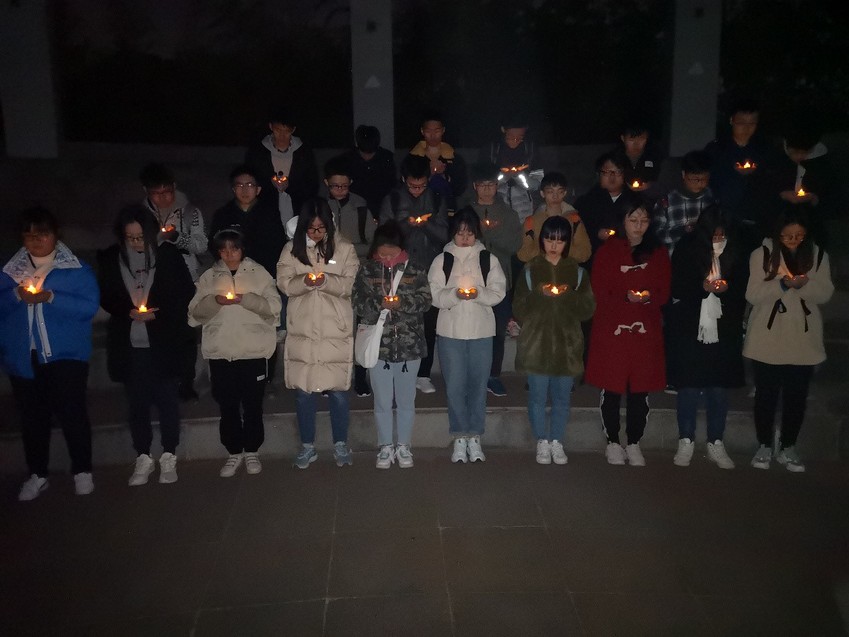 观影结束后,班长王海鹏为同学们解读了国家公祭日的悼念意义,并带领同学们来到小浪底进行默哀仪式。仪式过程中,同学们手捧蜡烛,缅怀逝者,祈祷和平。