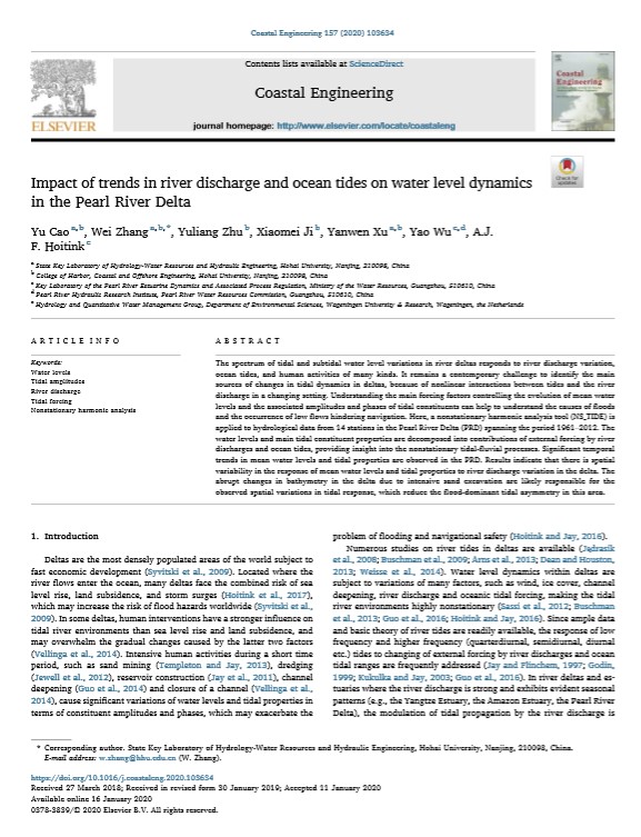 近日,我院硕士研究生曹煜(已毕业,全国首届高等学校水利类优秀研究生学位论文获得者)与其导师张蔚教授(通讯作者)在中信所一区,海岸工程类排名第一的国际学术期刊《Coastal Engineering》上发表高质量学术论文:“Impact of trends in river discharge and ocean tides on water level dynamics in the Pearl River Delta”。近年来,我院加大硕士研究生的培养力度,包括学院支持硕士研究生短期访学和国际交流,极大的促进了高水平成果的产出。