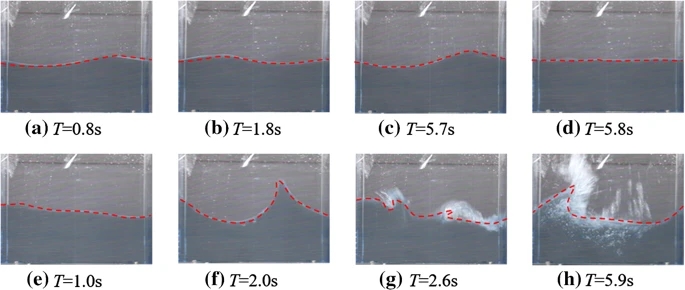 Fig. 1 Comparisons of free surface profiles in the tank by experimental and numerical method. a–d: frequency ratio =0.84, e–h: frequency ratio =1.0, red dashed line represents the free surface obtained numerically).