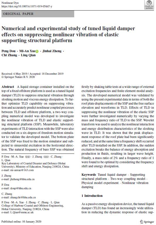 我院港口、海岸及近海工程专业窦朋博士生在导师郑金海教授和薛米安副教授的共同指导下,以第一作者在力学领域国际顶级期刊《Nonlinear Dynamics》上在线发表论文“Numerical and experimental study of tuned liquid damper effects on suppressing nonlinear vibration of elastic supporting structural platform” (//doi.org/10.1007/ s11071-019-05447-y)。