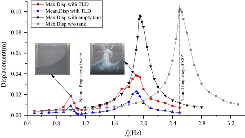 在av影片 六自由度液舱晃荡振动台上,建立调谐液体阻尼器与弹性支撑结构海洋平台双向流固耦合作用的物理试验模型,利用激光位移传感器构建了上部平台位移响应的高精度非接触式测量系统。基于ANSYS Workbench研发界面耦合算法,建立三维数值仿真模型,模型中流固耦合边界定义在流体压力及结构变形发生的水箱内壁,流体解和固体解仅在此界面进行数据交换,不仅大大提高了计算效率,而且有效地节约了计算机内存。在此基础上,探明了耦合系统动态响应过程中,调谐液体阻尼器内部的晃荡波面形态(Fig. 1)与其阻尼性能之间的关联机制、耦合模型上部平台位移衰减率、能量耗散率及水箱内晃荡波面的谱峰频率对流体与固体之间的质量比、调谐频率比(Table 1)等关键参数的依赖关系,提出了基于耦合试验模型的最优减振质量比及频率调谐比参数,阐明了调谐液体阻尼器对结构平台吸能和调频为主的振动控制机制(Fig. 2),为其在原型海洋平台等结构减振领域的设计及应用提供科学依据。
