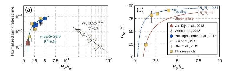 图2 岸壁后退速率、坍塌贡献与岸壁高度和水深的关系(Hb: 岸壁高度;Hw:近岸水深)