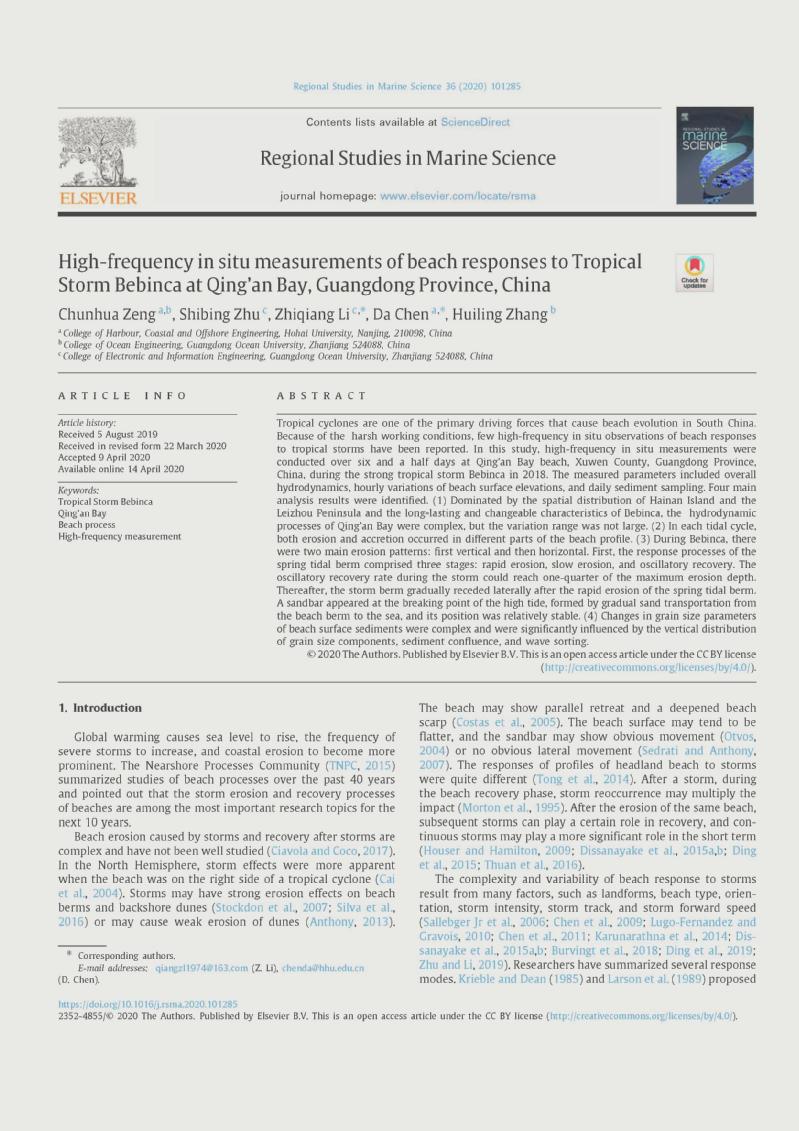 近日,我院陈达教授指导的博士研究生曾春华在《Regional Studies in Marine Science》(二区)上发表了题为“High-frequency in situ measurements of beach responses to Tropical Storm Bebinca at Qing’an Bay, Guangdong Province, China”的学术论文。