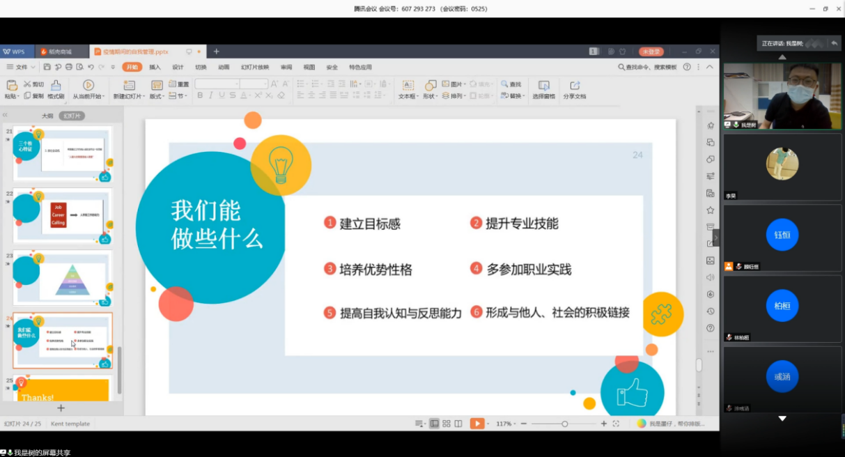 首先,赵东伟老师结合当前疫情的特殊形势,重点分析了“拖延”现象并提供了六点解决办法。其次,赵老师对疫情期间常见的焦虑、恐惧和抑郁情绪进行了细致的分析,强调学生要根据自己当前的状态和能力适当调整自己的目标。同时,针对即将步入职场的毕业生们,赵老师举例分析了三种工作取向——谋生、职业以及使命,进而引导毕业班学生树立理性积极的就业观。