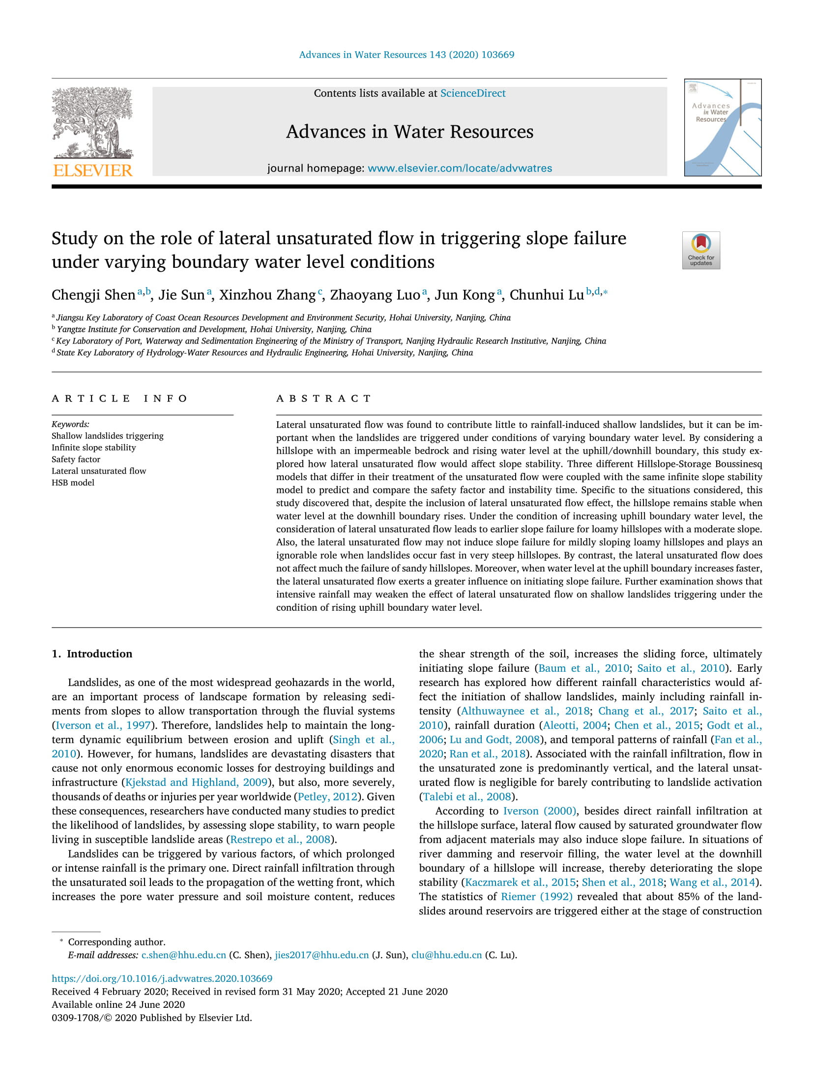 近日,我院海防所教师沈城吉博士、孔俊教授等在国际权威期刊《Advances in Water Resources》上发表了题为“Study on the role of lateral unsaturated flow in triggering slope failure under varying boundary water level conditions”的学术论文。