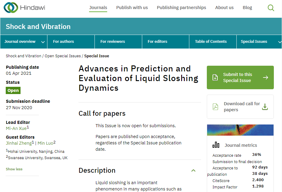 我院薛米安教授、郑金海教授、英国Swansea University罗敏博士受邀担任国际学术期刊《Shock and Vibration》客座主编,组织专刊“Advances in Prediction and Evaluation of Liquid Sloshing Dynamics(液体晃荡动力过程研究进展)”,旨在征集最新的预测和评估液体晃荡载荷和海洋结构响应及两者耦合效应的研究成果,以及相关综述性文章。