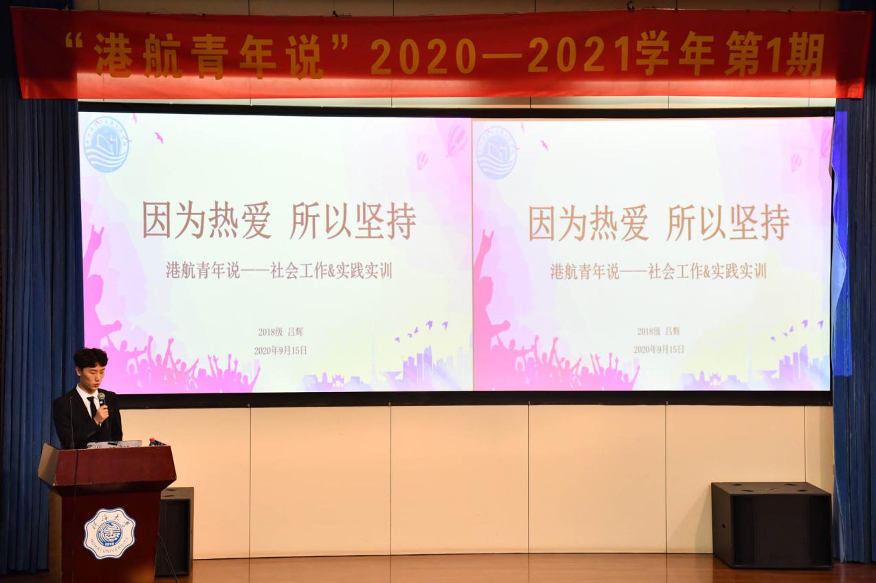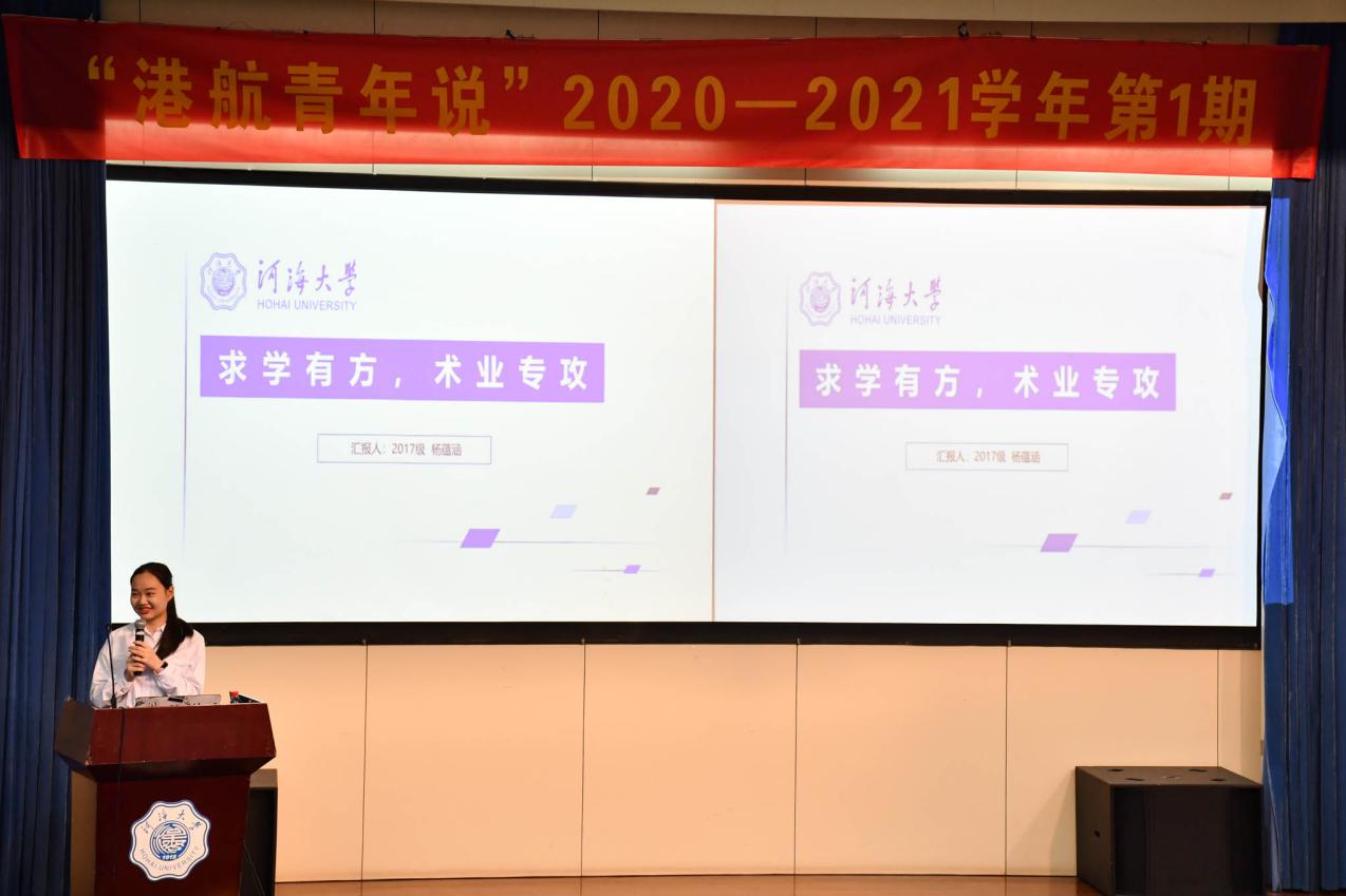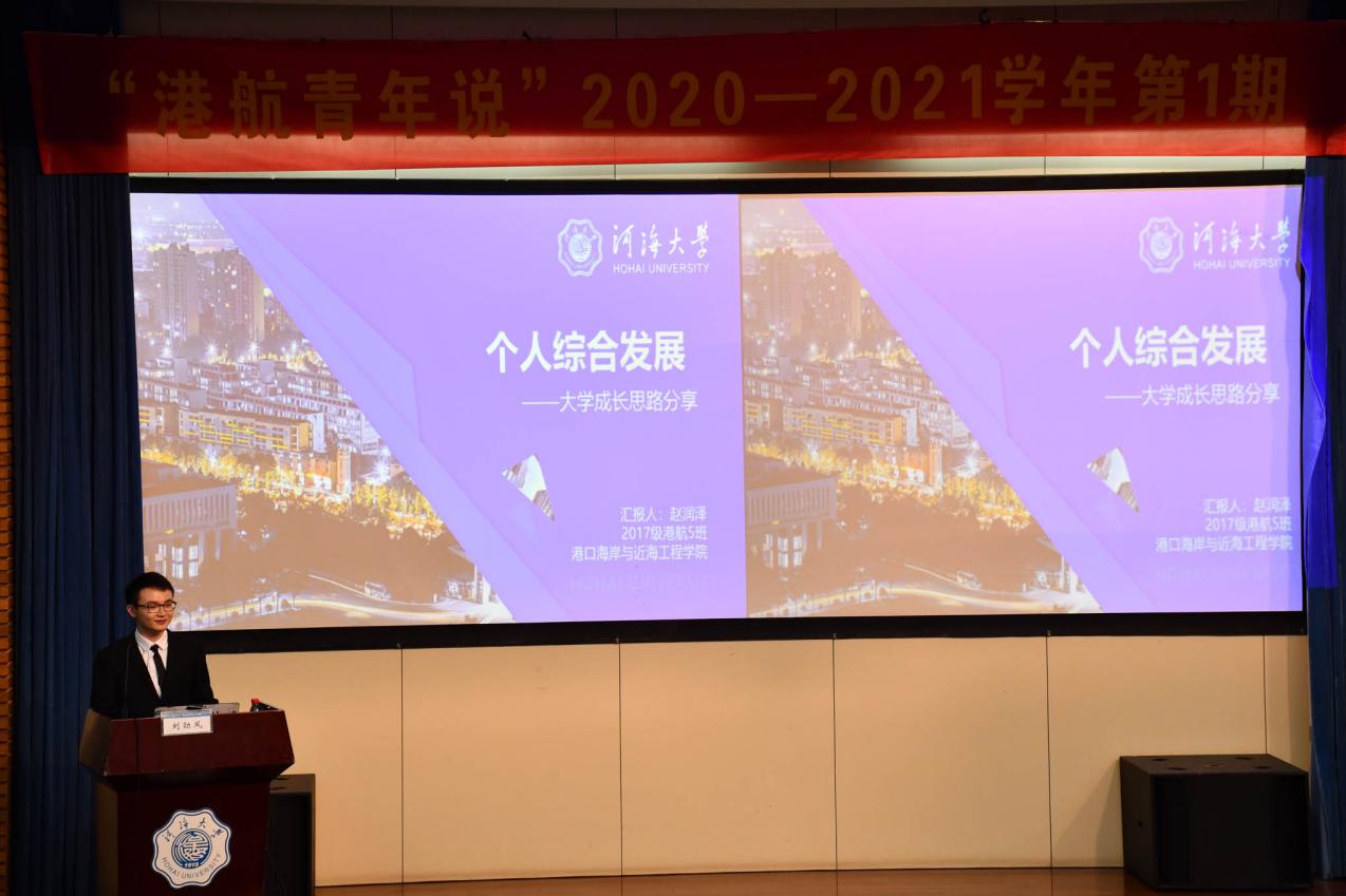 2020年9月15日下午,av影片 在江宁会议中心二楼报告厅举行2020—2021学年第1期“港航青年说”。此次讲座邀请到学院2017级本科生赵润泽、杨蕴涵、陆发靖、张骆宁以及2018级本科生吕辉,就综合发展、学习研究、创新创业、志愿服务和社会工作等方面向2020级新生进行经验分享。