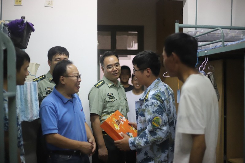 2020年9月30日,恰逢国庆与中秋双节临近之际,av影片 党委书记胡忠华、副书记沈国军在2020级辅导员林晨的陪同下来到江宁校区教学区六舍和八舍,亲切慰问了顺利完成军训的2020级本科新生,赠送了学院精心准备的月饼,为新生们带来了中秋祝福。