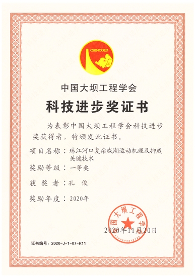 我院孔俊教授参与完成的“珠江河口复杂咸潮运动机理及抑咸关键技术”项目获2020年度中国大坝工程学会科技进步一等奖。该项目针对新时期珠江河口咸潮防控的需求和薄弱环节,深入研究了河口区径潮相互作用下的咸淡水混合机制及上溯过程,提出了水幕抑咸技术、最优化阻水调配模式和统计回归预报方法,创建了珠江河口“上补-中蓄-下阻”的综合防控体系。该成果广泛应用于珠江委、广东省水利厅及地市行政主管部门、供水企业等,为粤港澳大湾区水安全保障规划、珠江河口综合治理规划、珠江河口治导线规划、珠澳供水水库群联合调度规程编制等提供了有力的技术支撑,取得了显著的生态环境与社会经济效益。