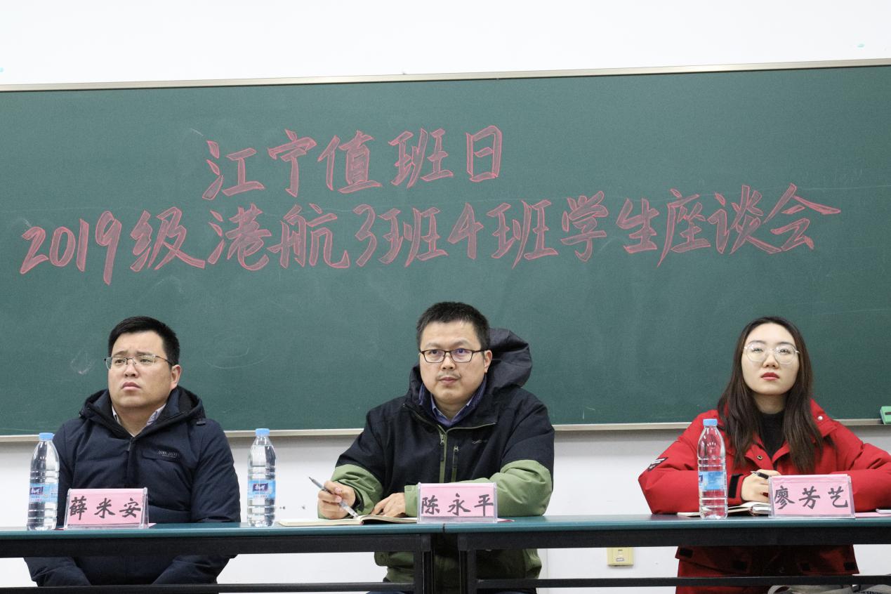 2020年12月8日下午14时,江宁值班日—2019级港航3班4班学生座谈会在江宁校区励学楼A209举行。av影片 陈永平副院长、2019级港航4班班导师薛米安老师、辅导员廖芳艺老师出席了本次座谈会。