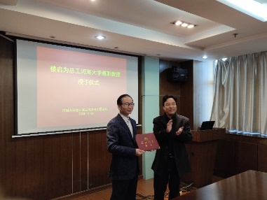 兼职教授聘任仪式,学校人事处处长张雪刚出席了仪式,并为楼启为教授颁发了证书,学院党委书记胡忠华、张蔚副院长,以及《水运工程施工》课程主要授课老师一并出席了仪式。