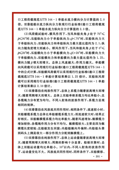 我院严士常老师具体完成的“舾装码头双排靠泊试验”得到双靠船舶分别在水流、风、波浪单独作用以及风浪流共同作用等不同工况下船舶运动和受力的规律,提出风荷载、船舶作用力和系缆力的计算方法,为本标准所采用。
