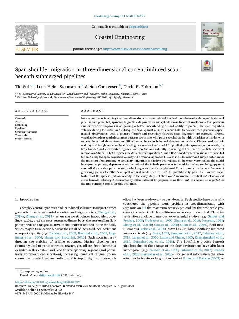 近日,我院教师隋倜倜在海底管道冲刷领域取得进展,与丹麦科技大学海岸工程团队合作研究成果在一区期刊《Coastal Engineering》上发表,标题为“Span shoulder migration in three-dimensional current-induced scour around submarine pipelines”。