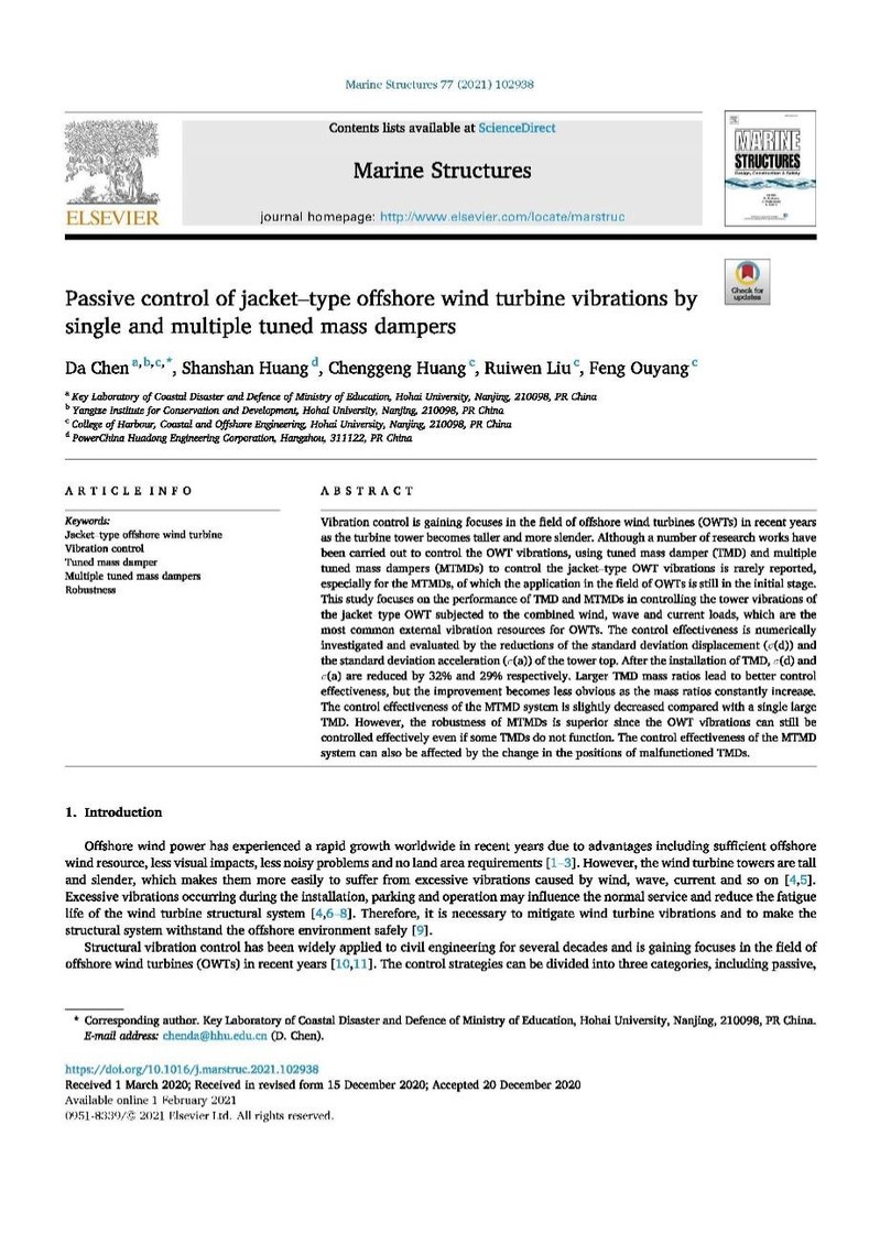 近日,我院陈达教授领衔的近海工程结构团队在海洋工程领域权威期刊《Marine Structures》(一区Top,影响因子2.708)上发表题为“Passive control of jacket-type offshore wind turbine vibrations by single and multiple tuned mass dampers”的学术论文。