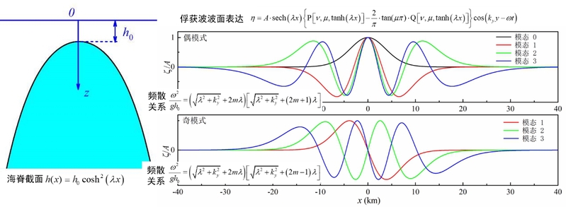 图 2 双曲余弦平方型海脊及奇偶模式俘获波波幅沿横截面分布