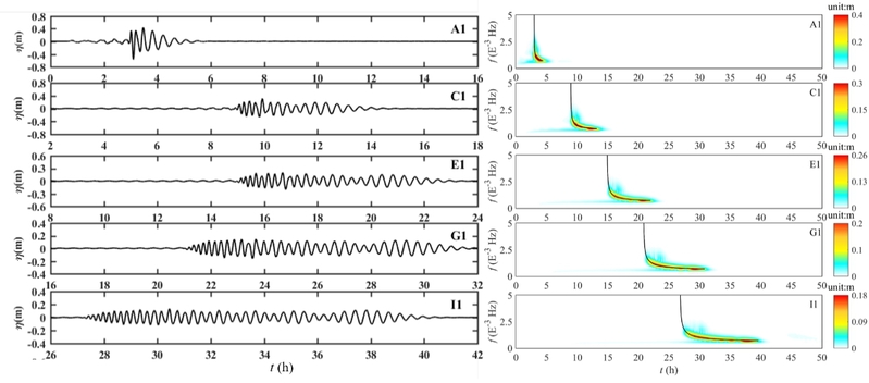 研究团队基于线性长波理论推导出了双曲余弦平方型大洋海脊上的俘获波解析理论,从波浪在海脊上的传播路径上阐明了海脊俘获波由于波浪折射效应而存在的产生机理。理论分析表明,大洋海脊上分别存在着奇偶模式的海脊俘获波,其波面过程可以表示为连带勒让德函数的形式。奇模式海脊俘获波的波面在脊顶始终为零,沿海脊两侧以反对称的形式运动;偶模式海脊俘获波的波幅在脊顶最大,波面在海脊两侧对称运动(图 2)。俘获波对应的频散关系可以表示为代数多项式的形式,由其可显式表达出相应的相位速度和能量速度。海脊俘获波的相位速度随着周期的增加而增加,但其能量速度却随着周期的增加而减小。通过数值计算模拟海啸在大洋海脊上的传播过程,结果表明大部分海啸波都被限制在海脊地形上以俘获波的形式传播,波幅沿海脊截面的分布与理论完全吻合(图 3);由海脊不同位置处的波面过程对应的小波谱证实了理论分析发现的短周期俘获波能量传播较快而率先抵达的现象(图 4)。
