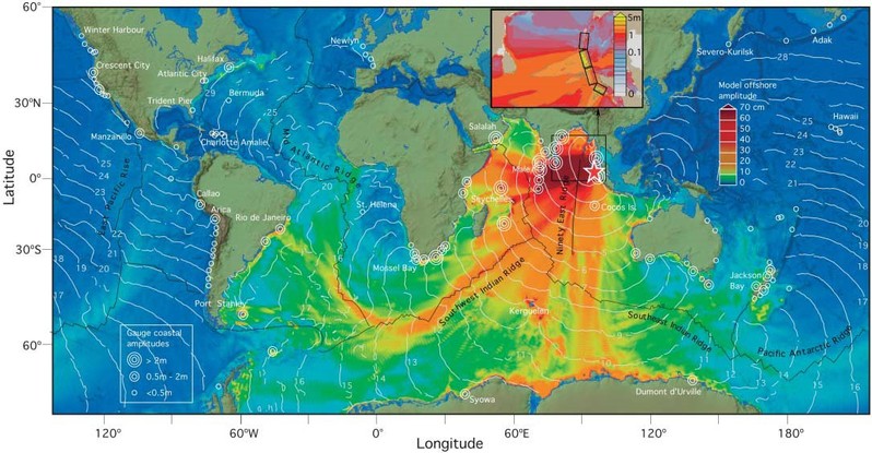 图1 2004年苏门答腊海啸最大波高分布与大洋海脊